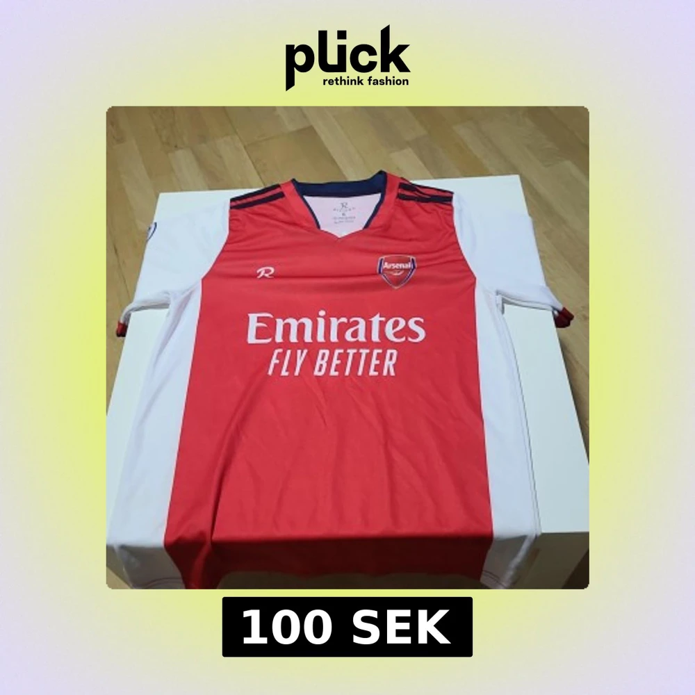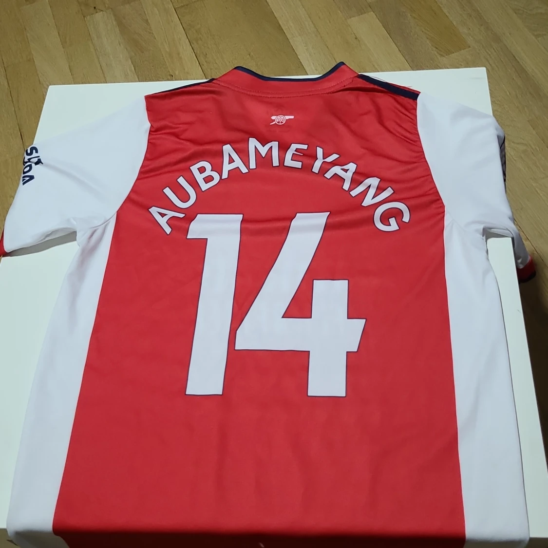 Säljer en Arsenal fotbollströja med Aubameyang 14 på ryggen. Tröjan är röd med vita ärmar och har mörkblå detaljer vid kragen och axlarna. Emirates Fly Better tryck på bröstet och klubbmärke på vänster sida.
