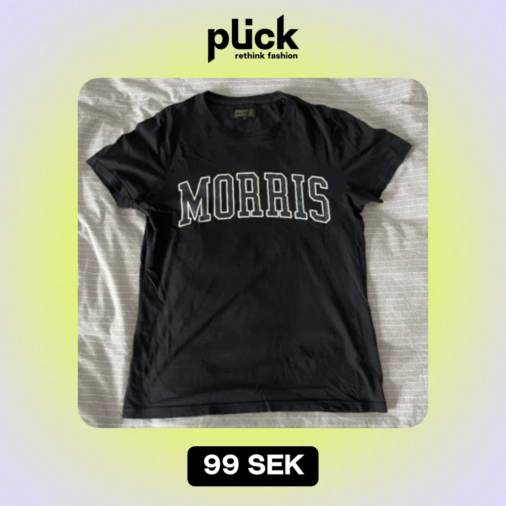 Mörkblå Morris T-Shirt med tryck på bröstet Nypris: 250kr Skick: Bra, normalt använd, inga synliga brister