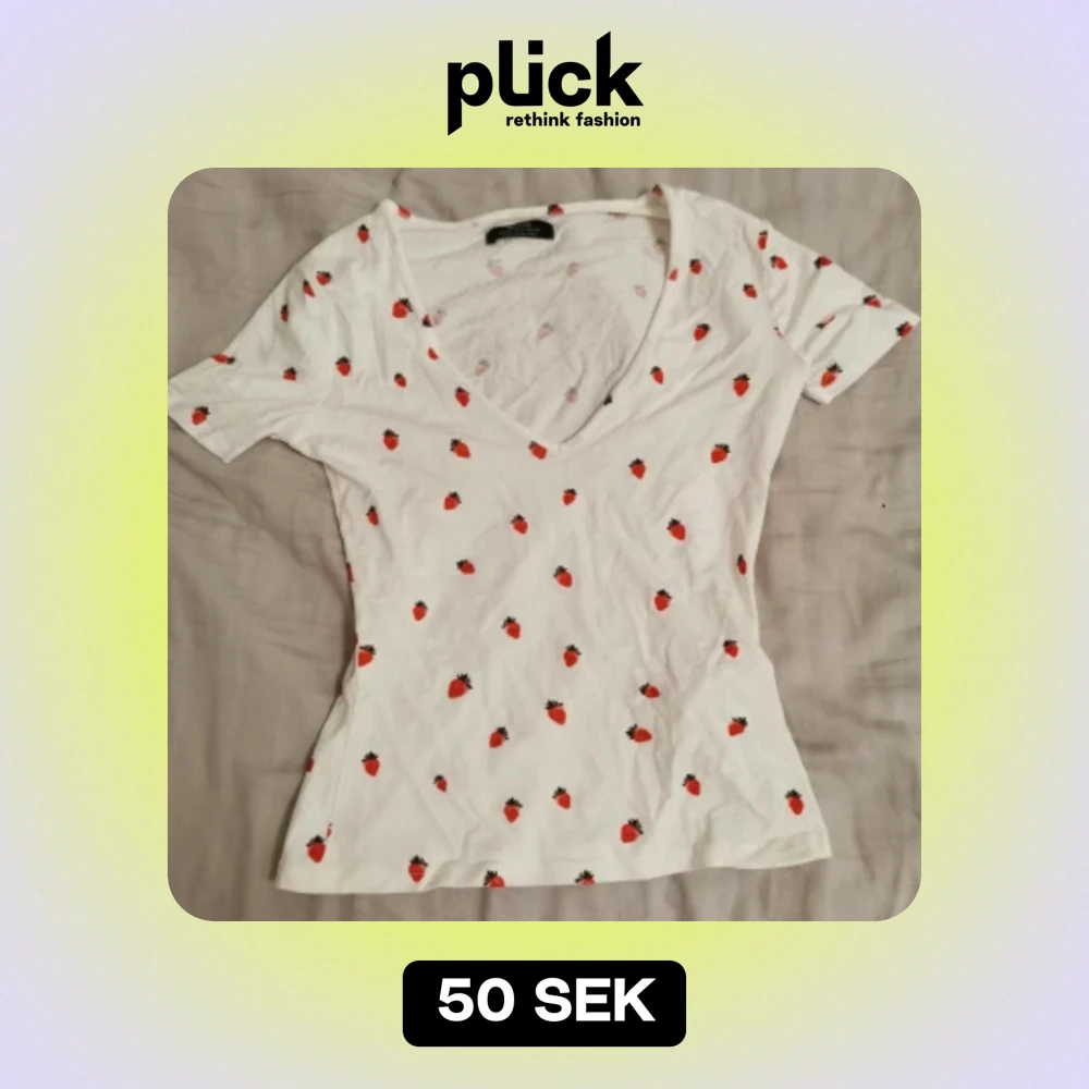 Tröja med jordgubbar i storlek M (passar S också). Aldrig använd