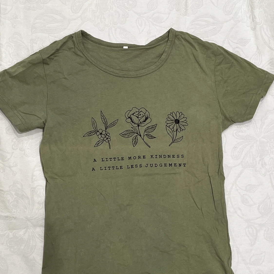 Söt grön t-shirt med fint citat och tryck. Står inget märke men storleken är S. Knappt använd så fint skick. Hör av dig vid intresse!
