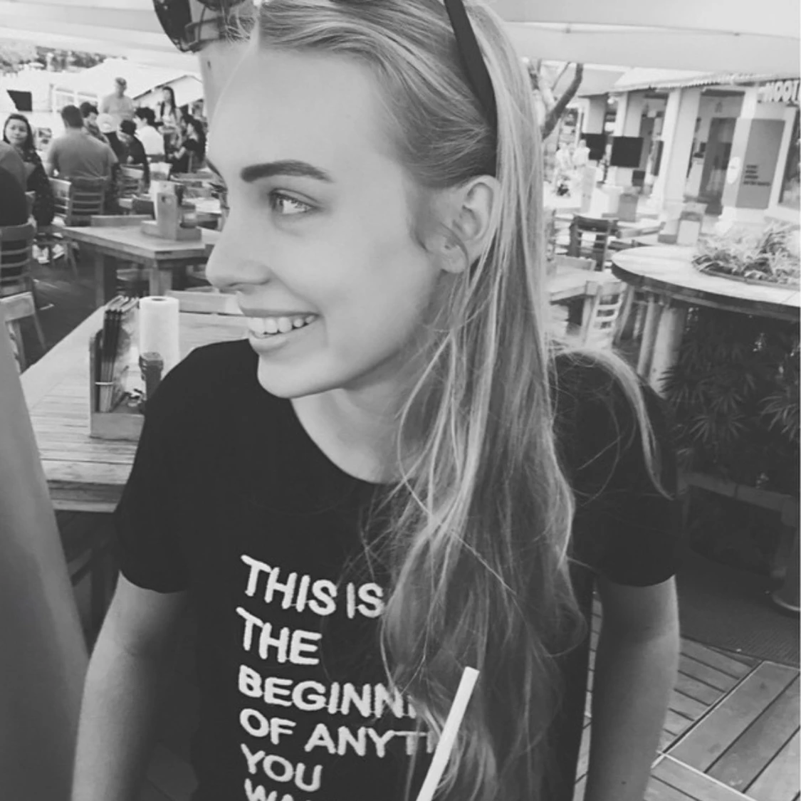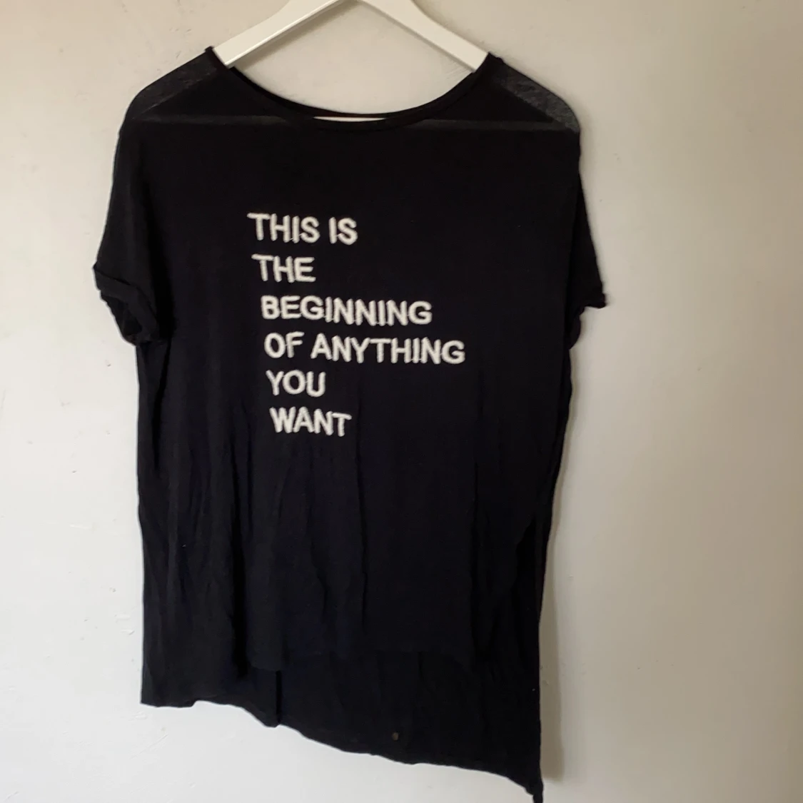 Cool T-shirt med broderad text. Slits på vänstra sidan från midjan neråt. Snygg och bekväm. *Litet hål längst ner där bak som man inte märker när den är på och går att sy ihop.