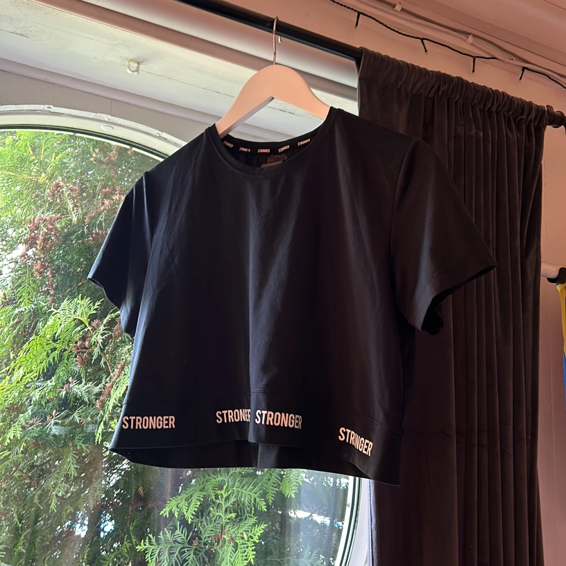 Säljer en t-shirt från stronger som nästan aldrig är använd. Den är kort och lös i modellen.