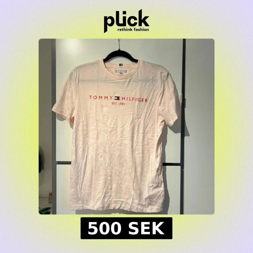 Säljer en stilren ljusrosa t-shirt från Tommy Hilfiger med röd logotyp. T-shirten är kortärmad och gjord i mjukt bomullsmaterial.