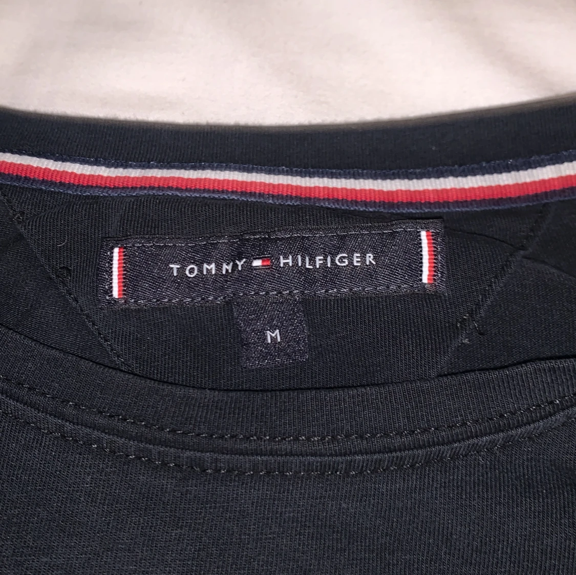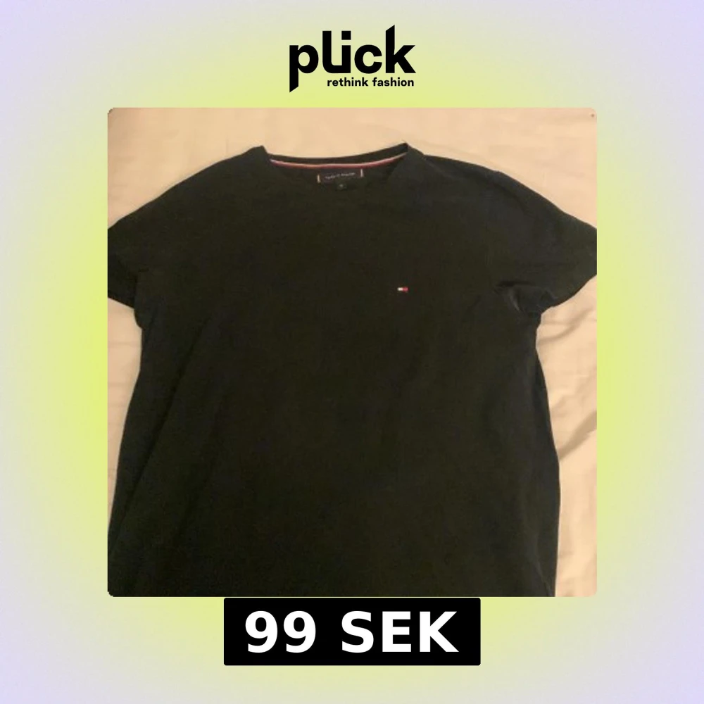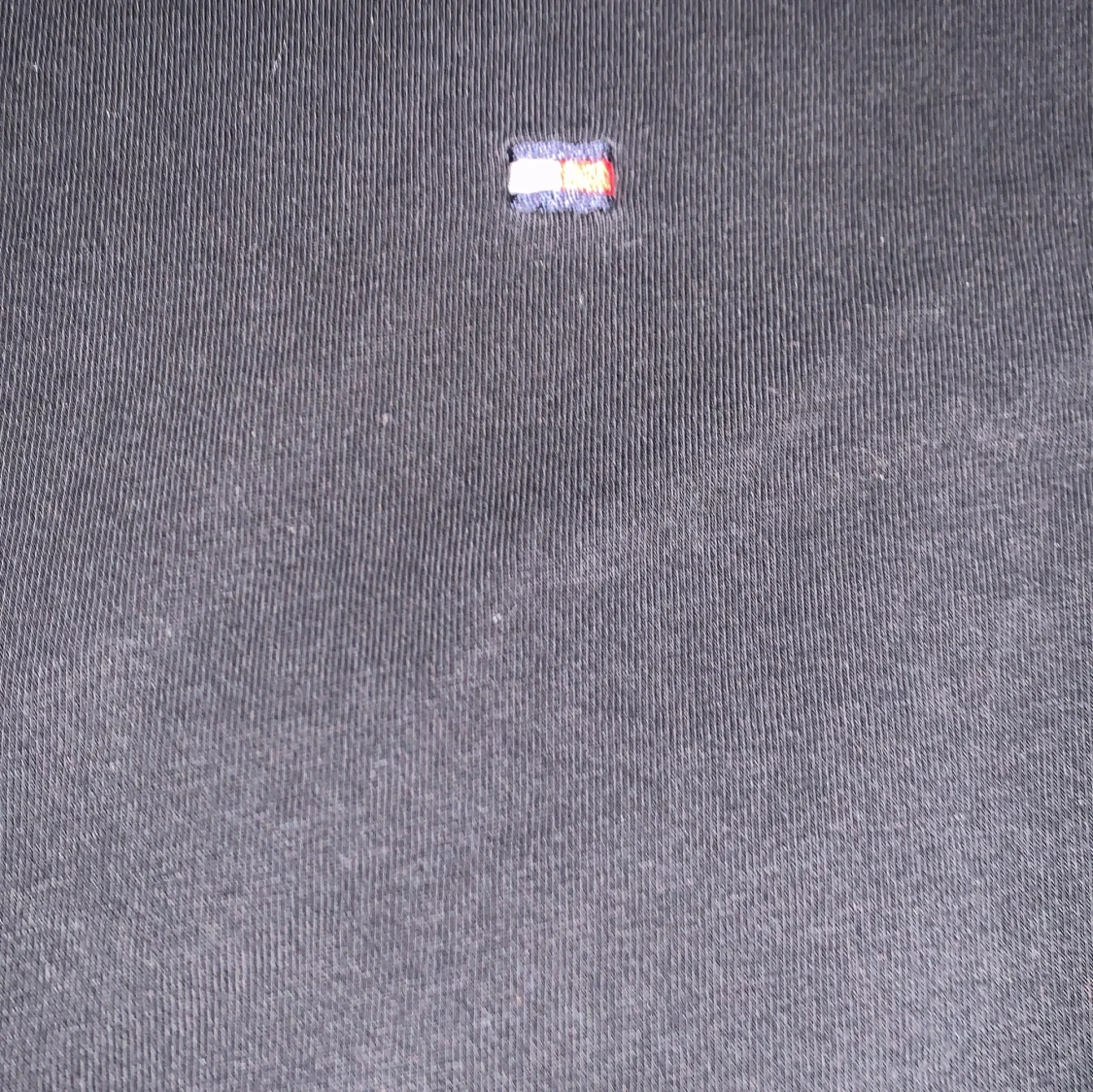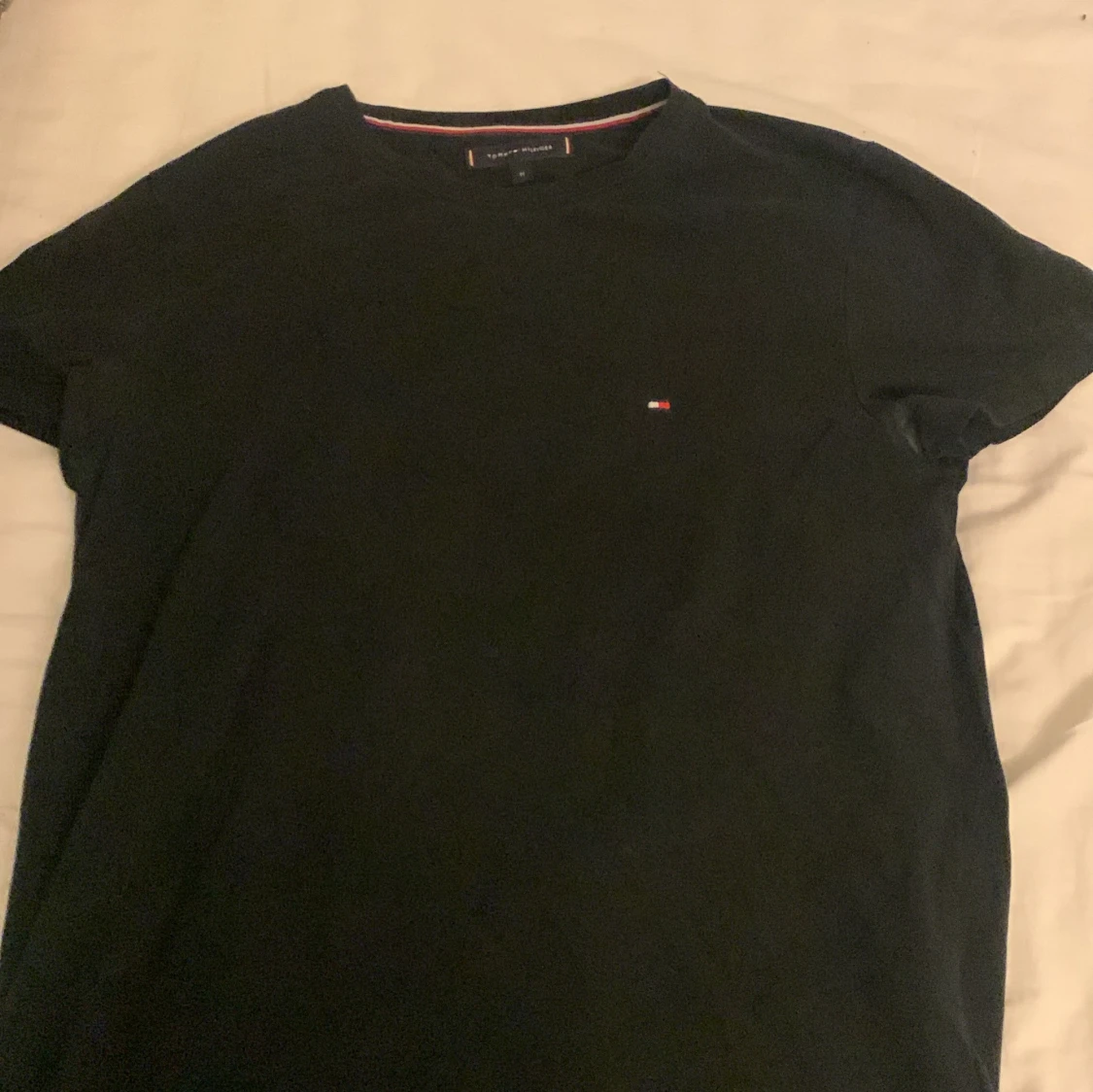 Säljer en stilren svart t-shirt från Tommy Hilfiger med deras ikoniska logga broderad på bröstet. T-shirten är kortärmad och tillverkad i mjuk bomull. Perfekt för en avslappnad look.