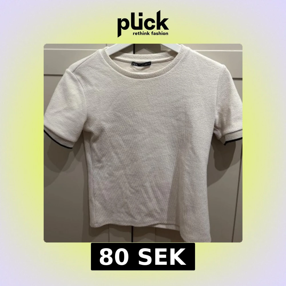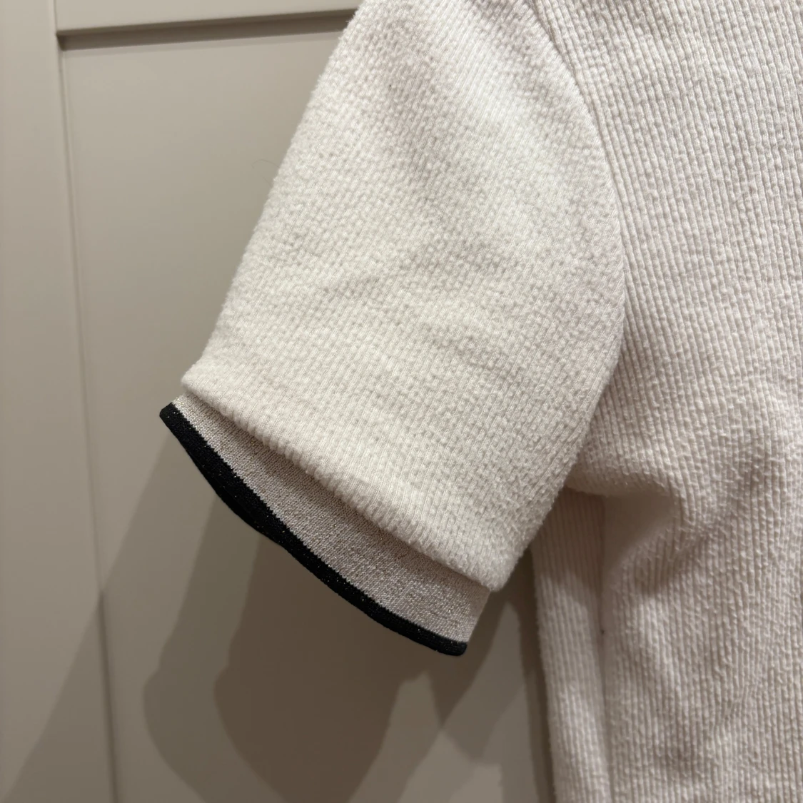Vit ribbad t-shirt från Zara med korta ärmar och svart kant på ärmsluten. Enkel och stilren modell med rund halsringning, perfekt för en clean look.