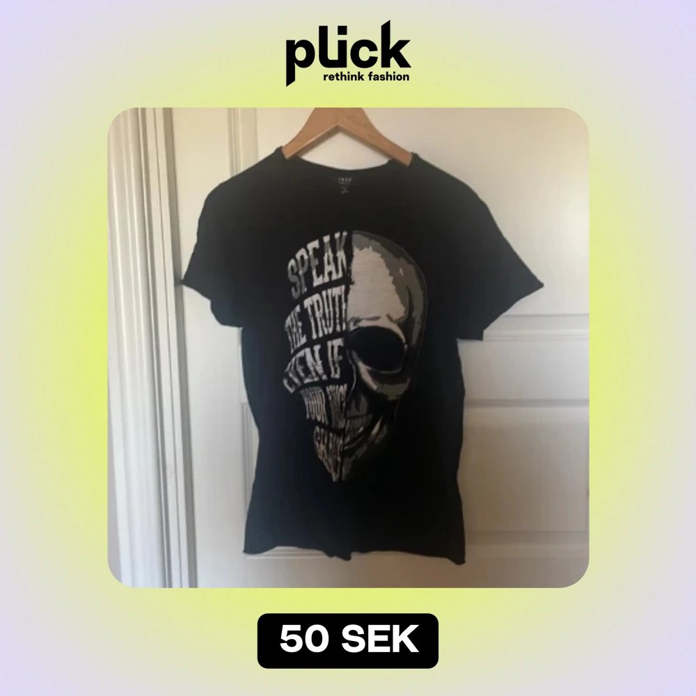 Vanlig svart T-shirt med print där det står ”speak the truth even if your voice shakes” Välanvänd men ändå i bra skick. Köpare står för frakt