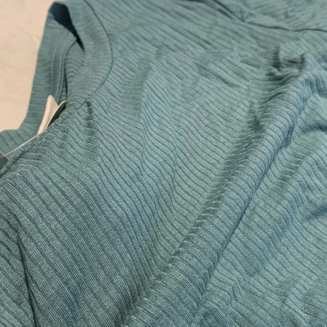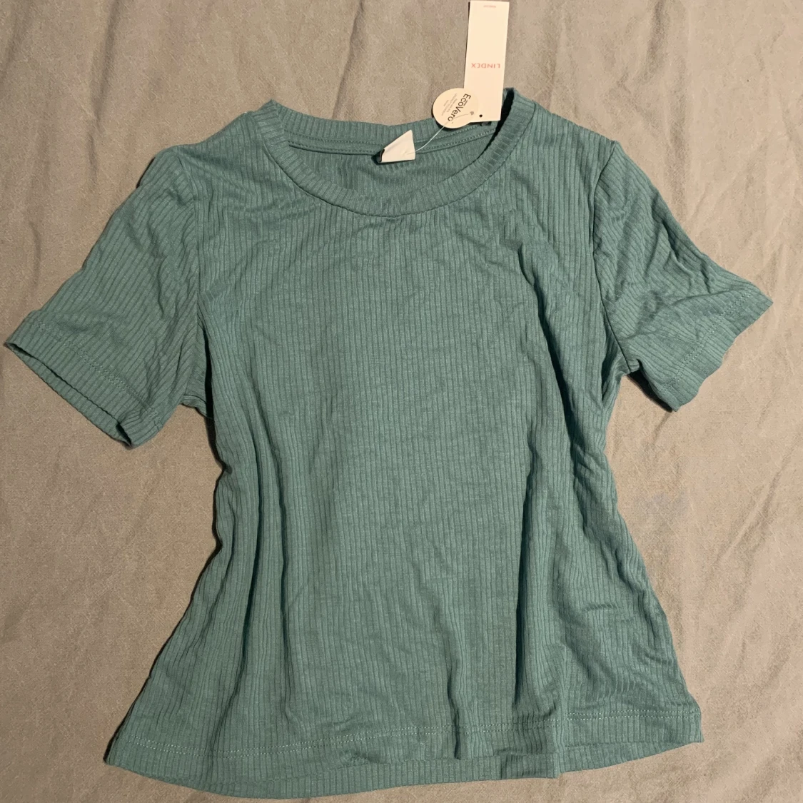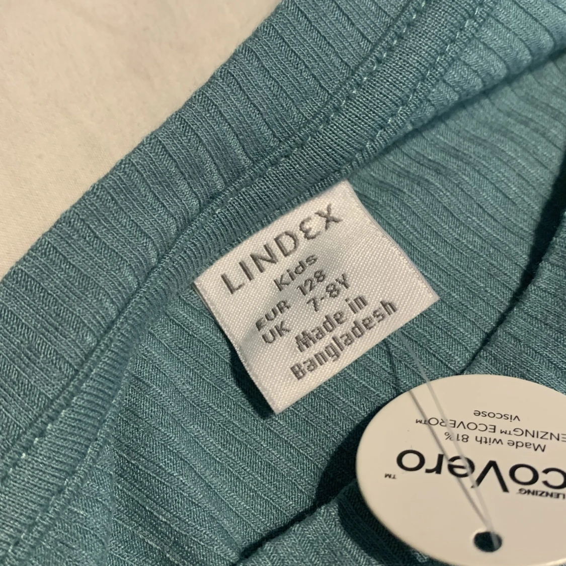 En grön/blå top från lindex, från barnavdelningen. Den passar mig som har XS/S på tröjor. Eftersom den är för barn så kan den vara tajt i ärmarna. Prislapp är kvar.