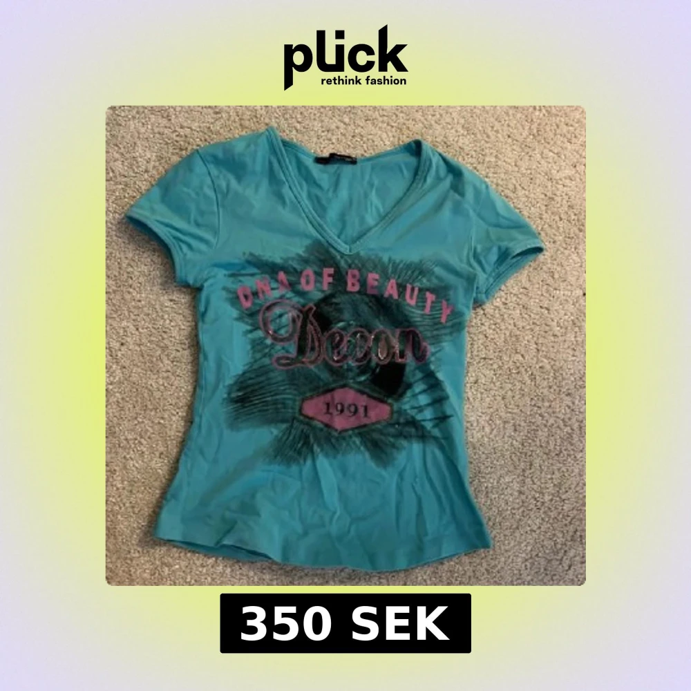 Snygg turkos t-shirt från Decon med tryck 'DNA of Beauty' i rosa och svart. T-shirten har en v-ringad hals och korta ärmar, perfekt för en avslappnad stil.
