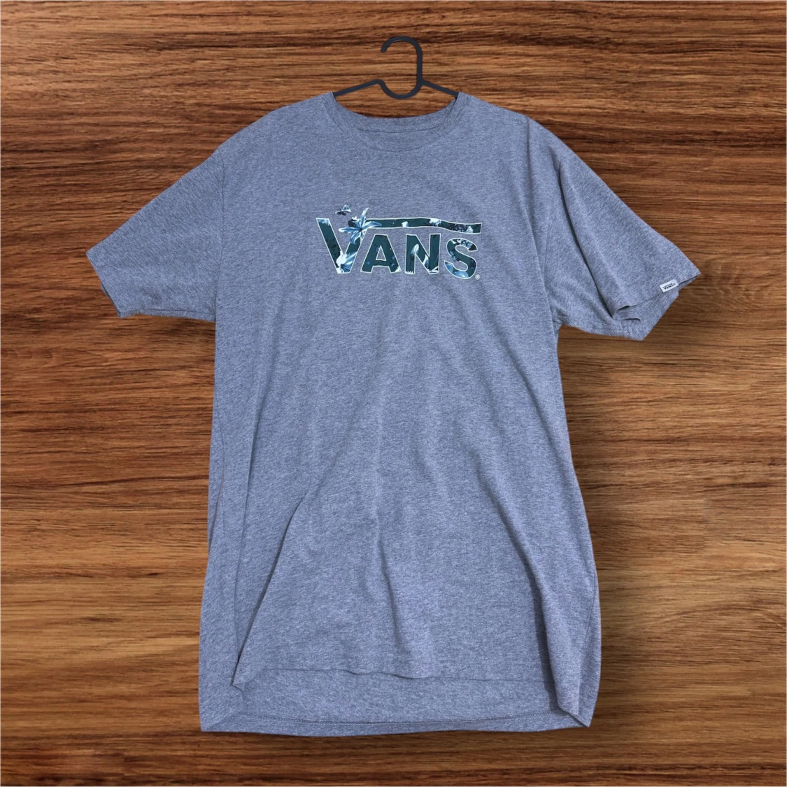 Nypris runt 350kr, gammal modell finns ej längre. Säljer en grå t-shirt från Vans med ett coolt camouflagemönster i loggan på bröstet. T-shirten har korta ärmar och är perfekt för en avslappnad stil. Passar bra till jeans eller shorts.