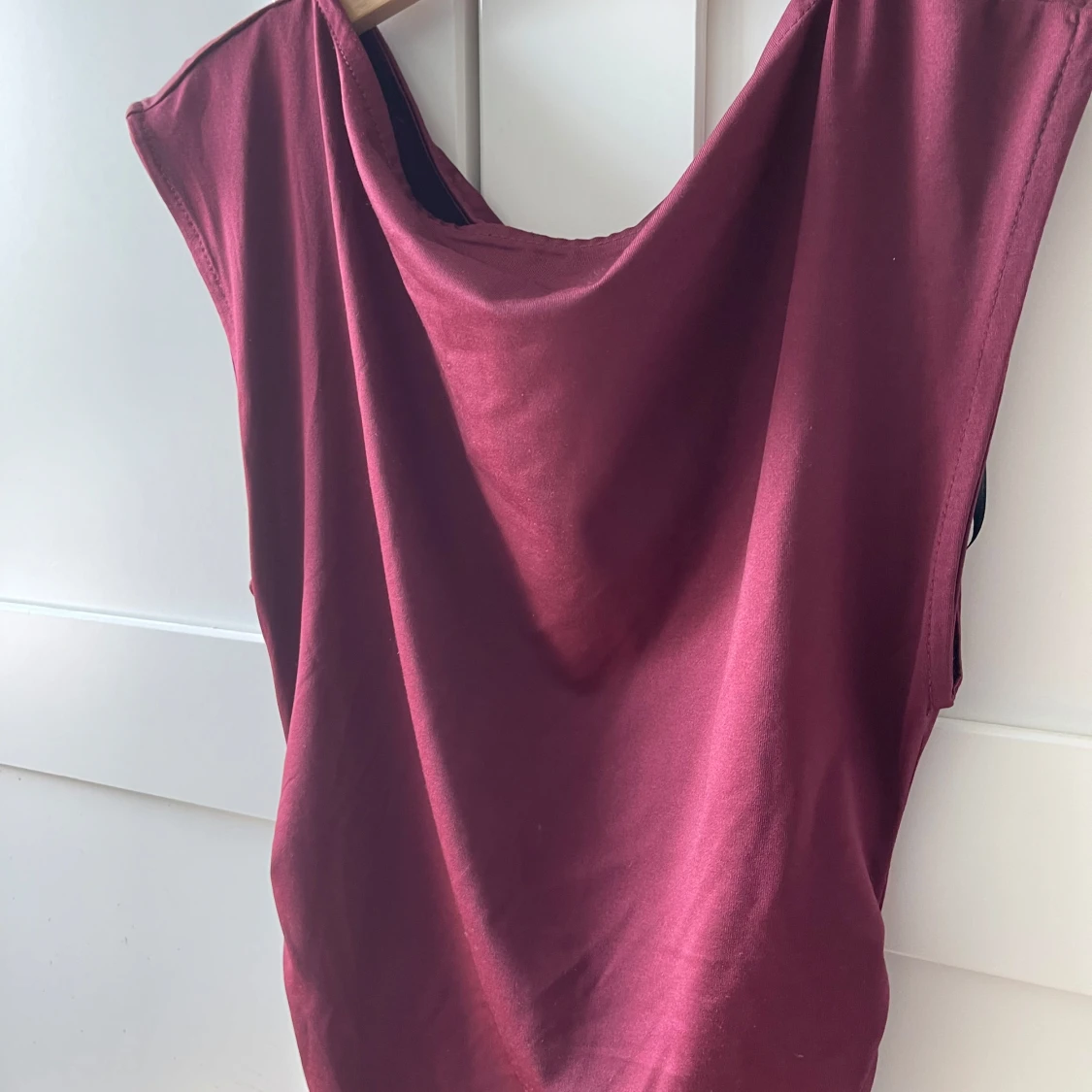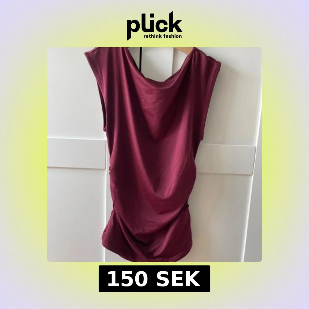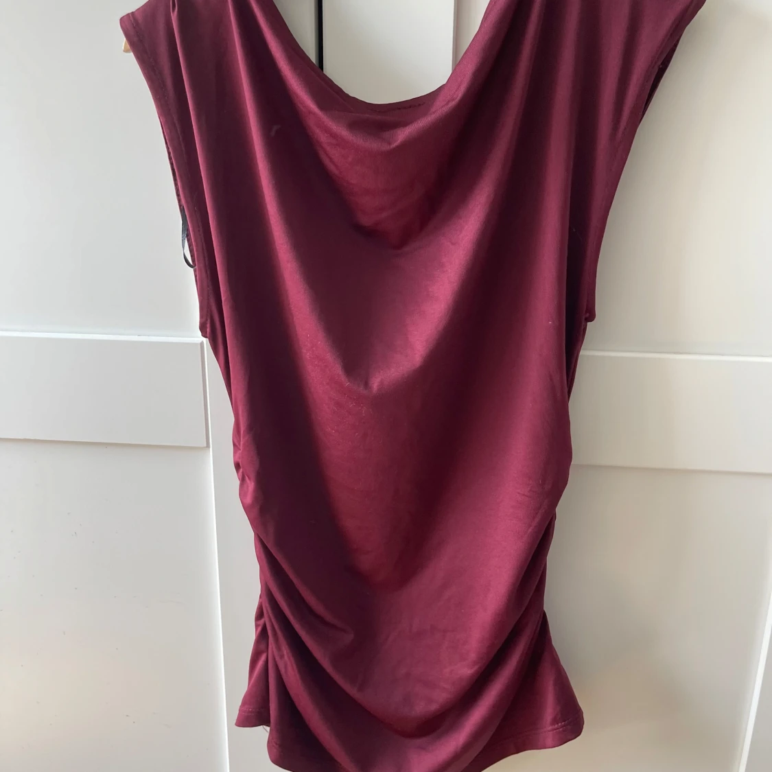 Säljer en vinröd topp från H&M i storlek XS. Toppen är ärmlös med en snygg draperad halsringning och har en kort längd. Materialet är mjukt och stretchigt, perfekt för dig som gillar enkel och stilren design.