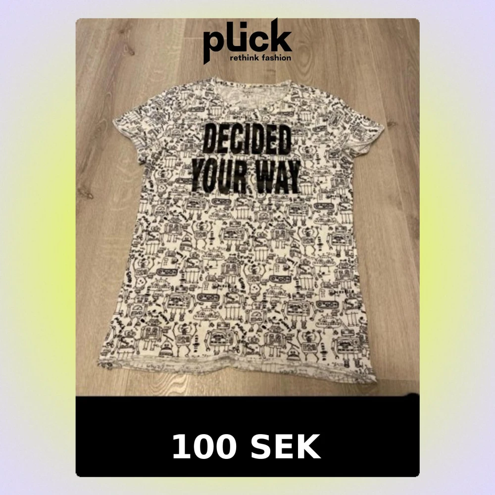 Säljer en vit t-shirt från DeFacto i slim fit med coolt robotmönster över hela plagget och stor svart text 'DECIDED YOUR WAY' på bröstet. T-shirten är kortärmad och har rund hals. Perfekt för dig som gillar unika prints och vill sticka ut.