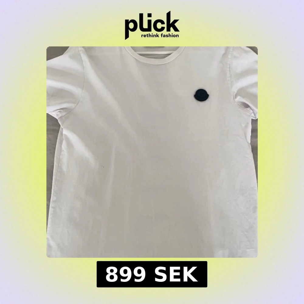 Snygg vit t-shirt från Moncler med en liten logga på bröstet och ett stort vertikalt tryck på ryggen. Perfekt för en stilren look.