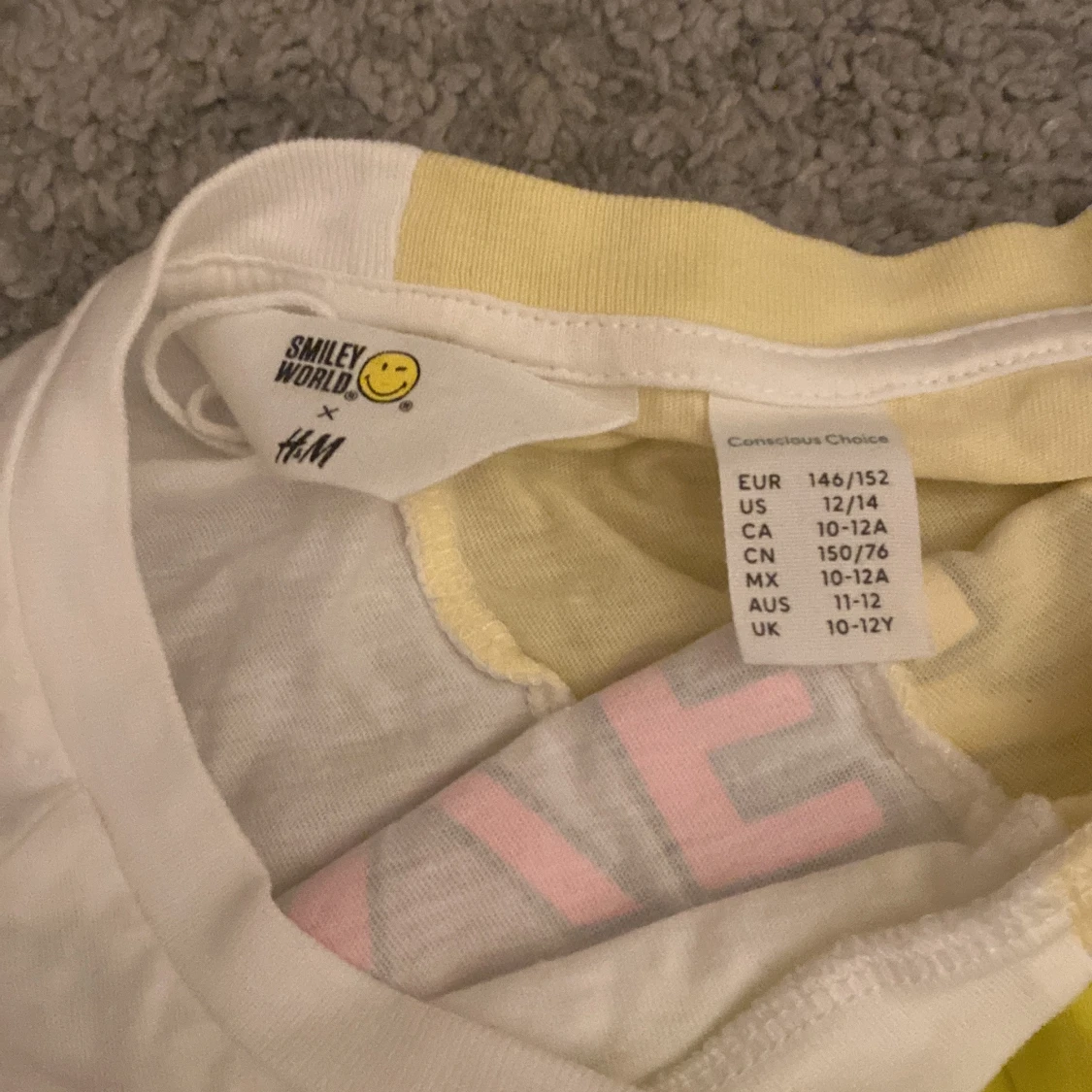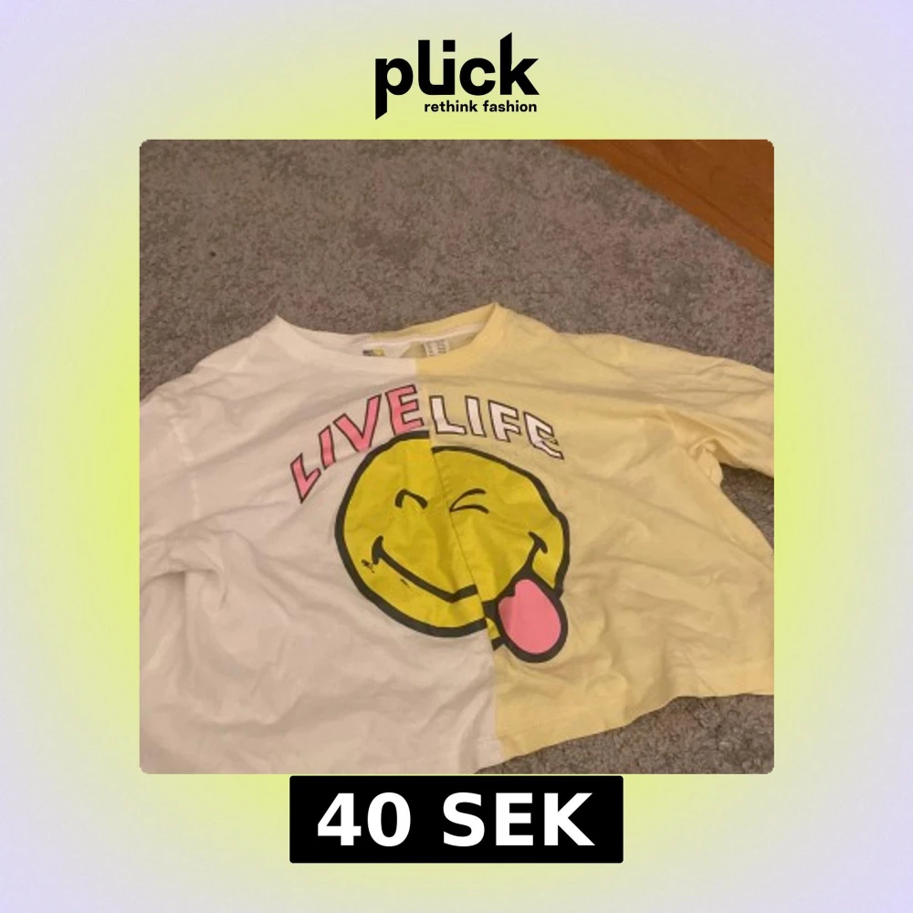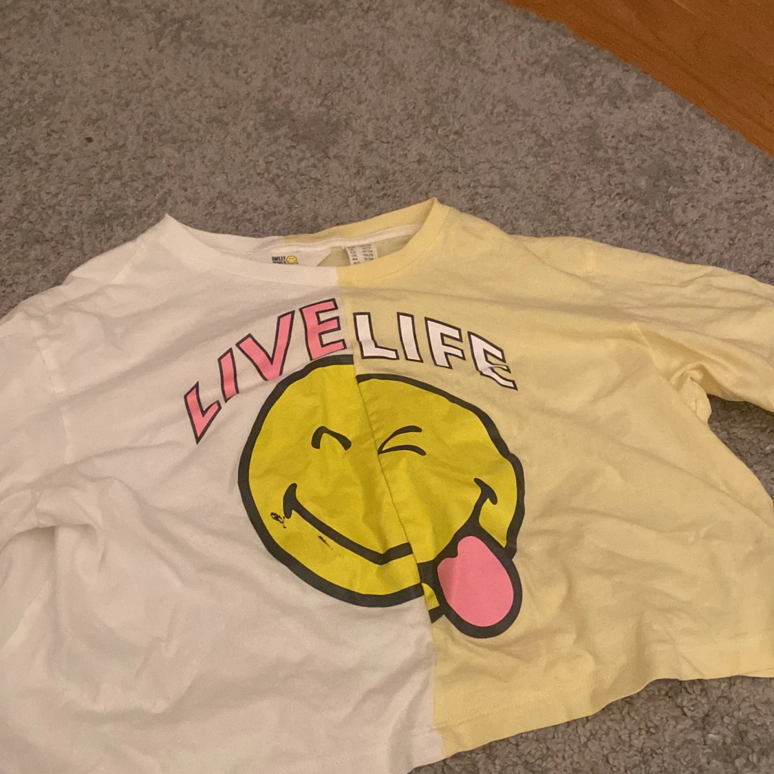 Cool t-shirt från H&M i samarbete med Smiley World. Den är delad i gult och vitt med ett stort smileytryck och texten 'LIVE LIFE' i rosa och vitt. Perfekt för lite yngre barn.