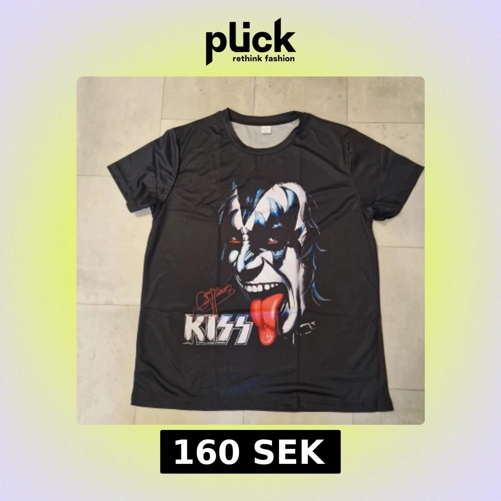 Cool svart t-shirt med stort tryck av Gene Simmons från KISS på både fram- och baksidan. T-shirten har korta ärmar och är gjord i mjuk polyester som känns skön mot huden. Perfekt för dig som vill sticka ut med en ikonisk rockstil.