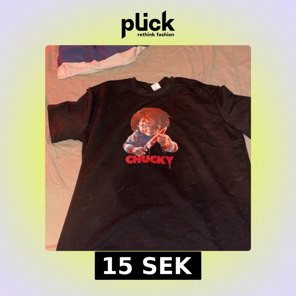 Cool svart t-shirt med Chucky-tryck på bröstet och röd text. Klassisk rund hals och korta ärmar. Materialet känns som mjuk bomull, perfekt för dig som gillar skräckfilmer och vill sticka ut med en unik graphic tee.