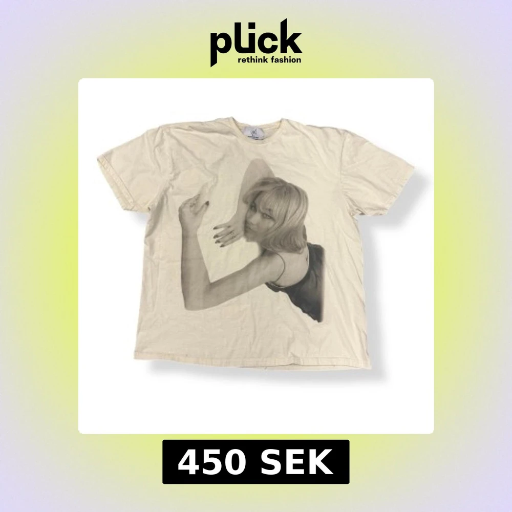 Beige t-shirt med stort svartvitt fototryck av Sabrina Carpenter på framsidan och turnétryck med texten 'emails i can't send' på baksidan. Klassisk passform och rund halsringning. Perfekt för fans av artisten. Endast tvättad.