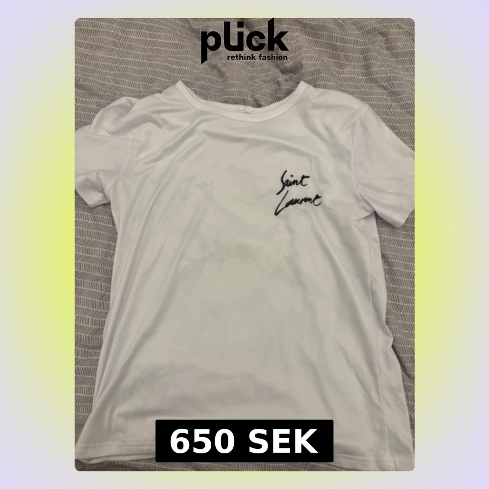 Säljer en clean vit t-shirt från Saint Laurent med svart logga tryckt fram och stort på ryggen. Klassisk rund hals och korta ärmar. Skön och mjuk bomull som passar perfekt till jeans eller shorts.