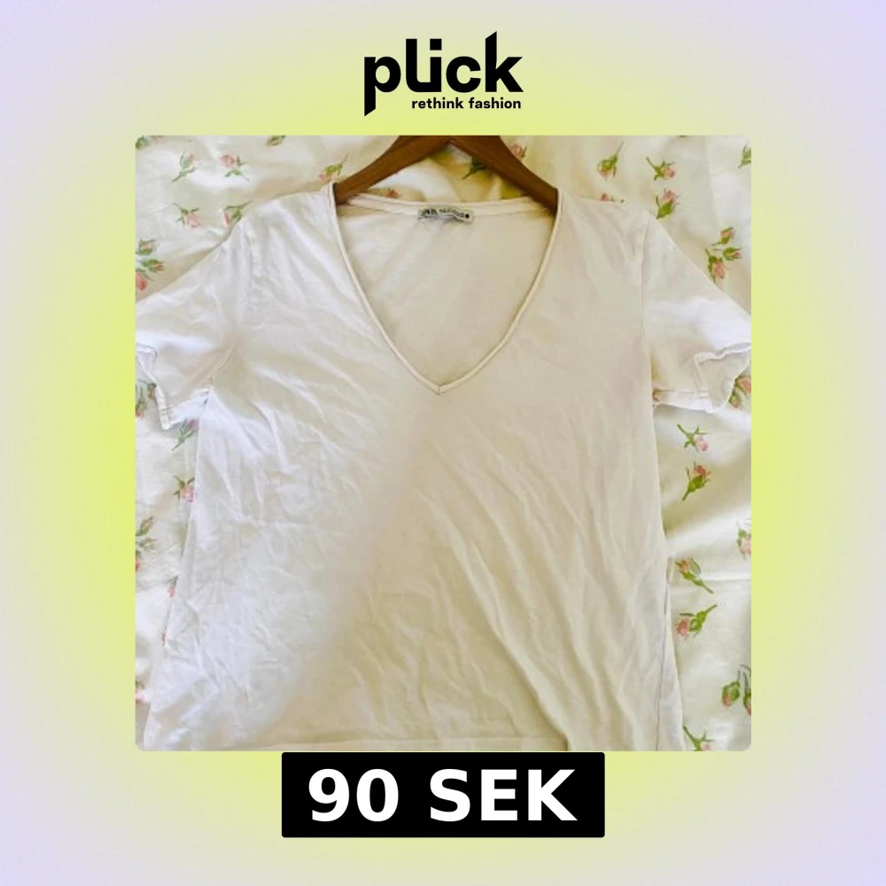 Säljer en stilren vit t-shirt från Zara med v-ringning. Perfekt för en avslappnad look. Gjord i mjukt material som känns skönt mot huden. Passar till det mesta i garderoben!