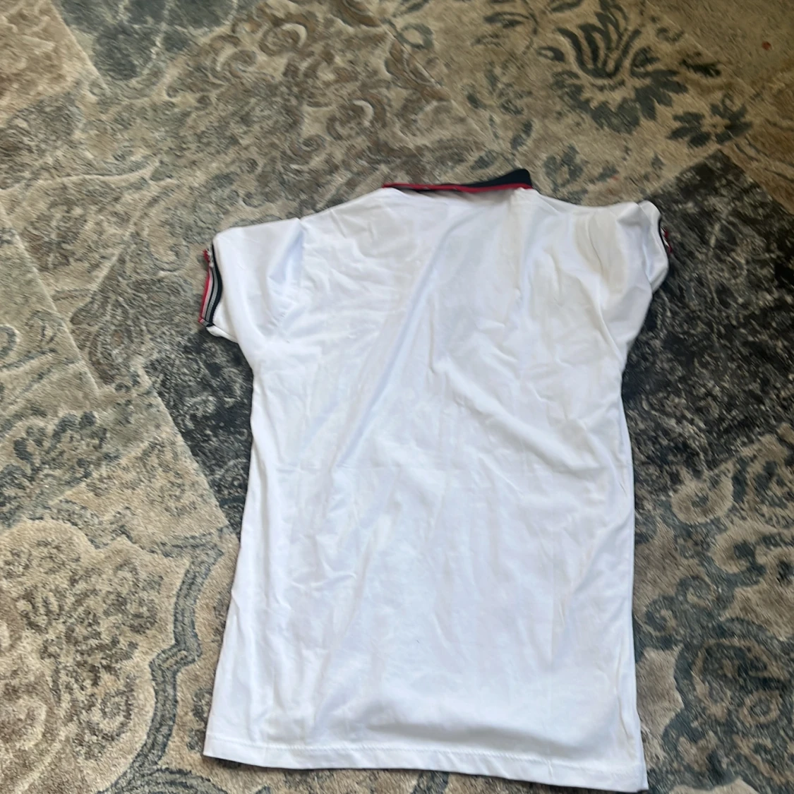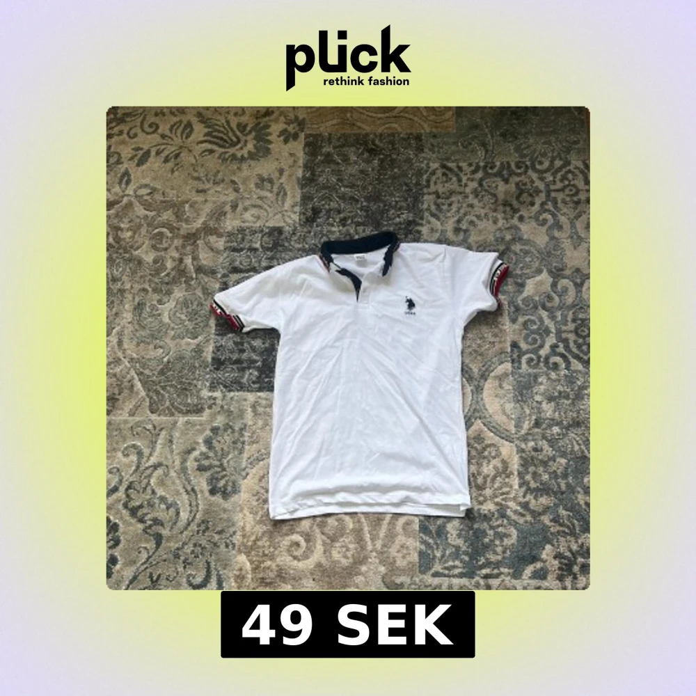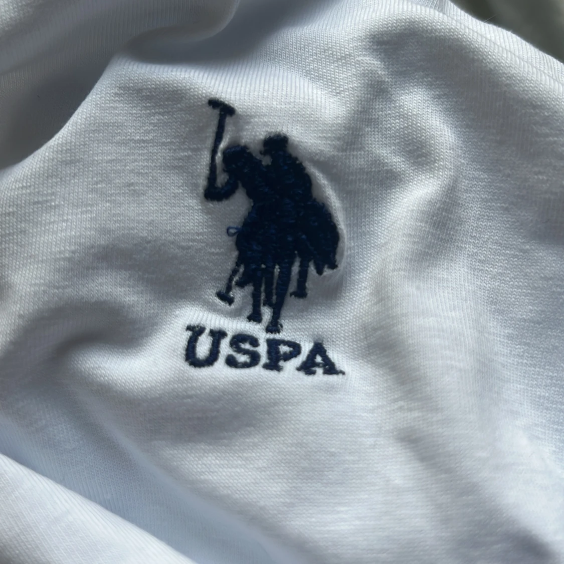 Vit pikétröja från USPA med mörkblå krage och ärmslut med röd, vit och blå rand. Broderad USPA-logga på bröstet. Klassisk piké med korta ärmar och knappslå vid halsen. Storlek är jag inte säker på men denna är liten skulle säga att den passar en 8 åring pojke
