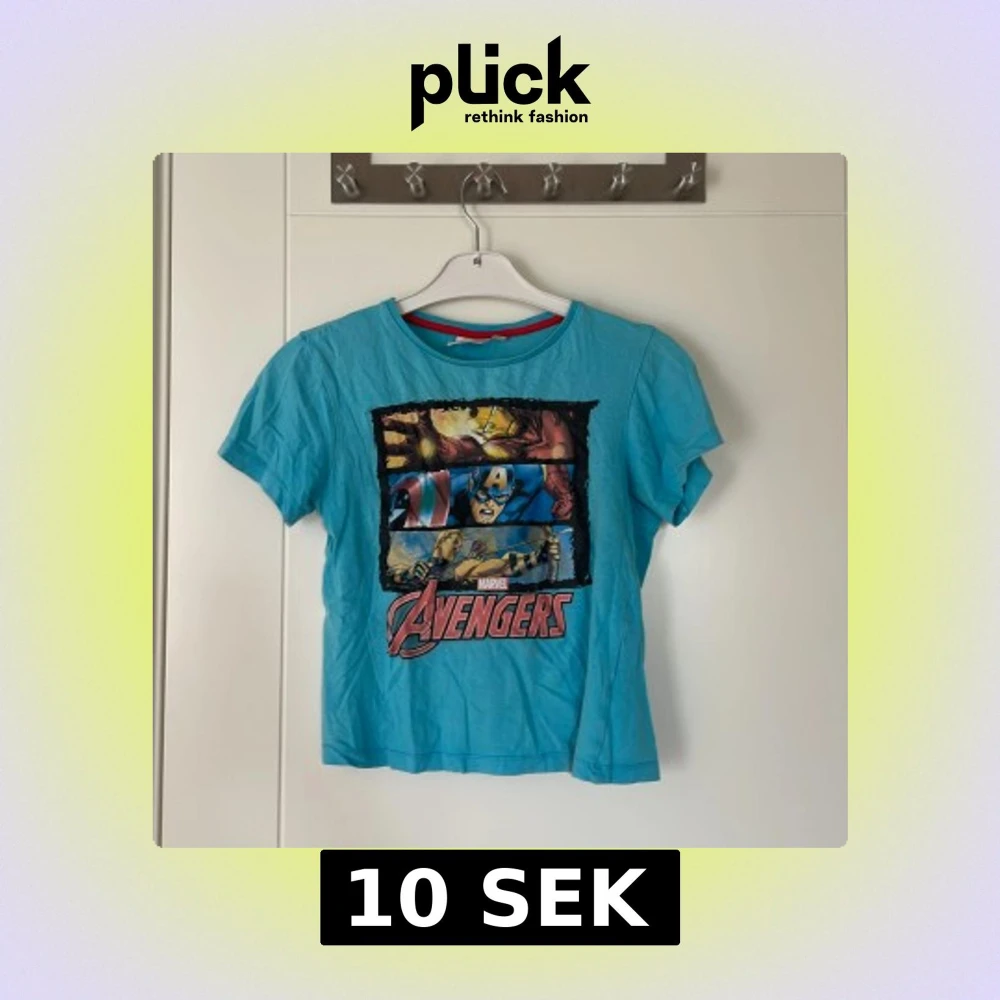 Cool blå t-shirt med tryck av Avengers-hjältarna Iron Man, Captain America och Thor på framsidan. T-shirten har rund hals med röd kant och är kortärmad. Perfekt för dig som älskar superhjältar och vill sticka ut med en färgstark look. Tröjan är barnstorlek men passar som XS/S.