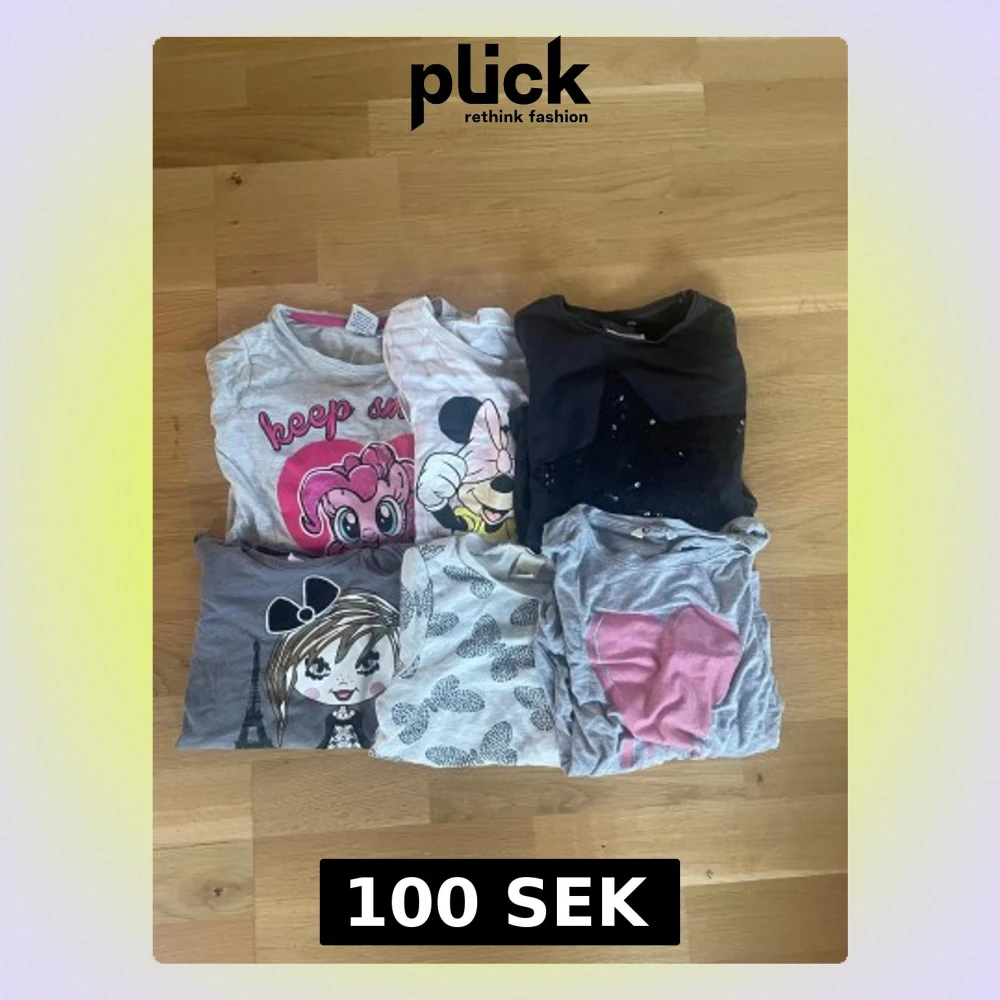 Säljer ett paket med 6 klädesplagg i olika färger och motiv, bland annat My Little Pony, Minnie Mouse, stjärna med paljetter, hjärta och rosett. Färgerna är mestadels grå, svart och rosa. Alla är kortärmade och gjorda i mjuk bomull, perfekta för dig som gillar coola prints och figurer.