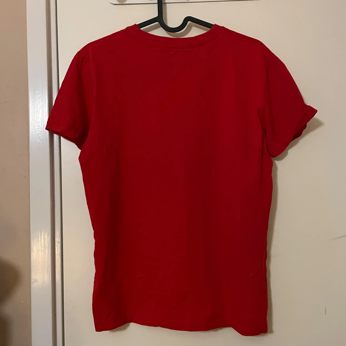 Säljer en klassisk röd t-shirt. Den har en enkel design med korta ärmar och en liten bröstficka. Perfekt för en avslappnad stil. Tillverkad i mjukt material för bekväm passform.