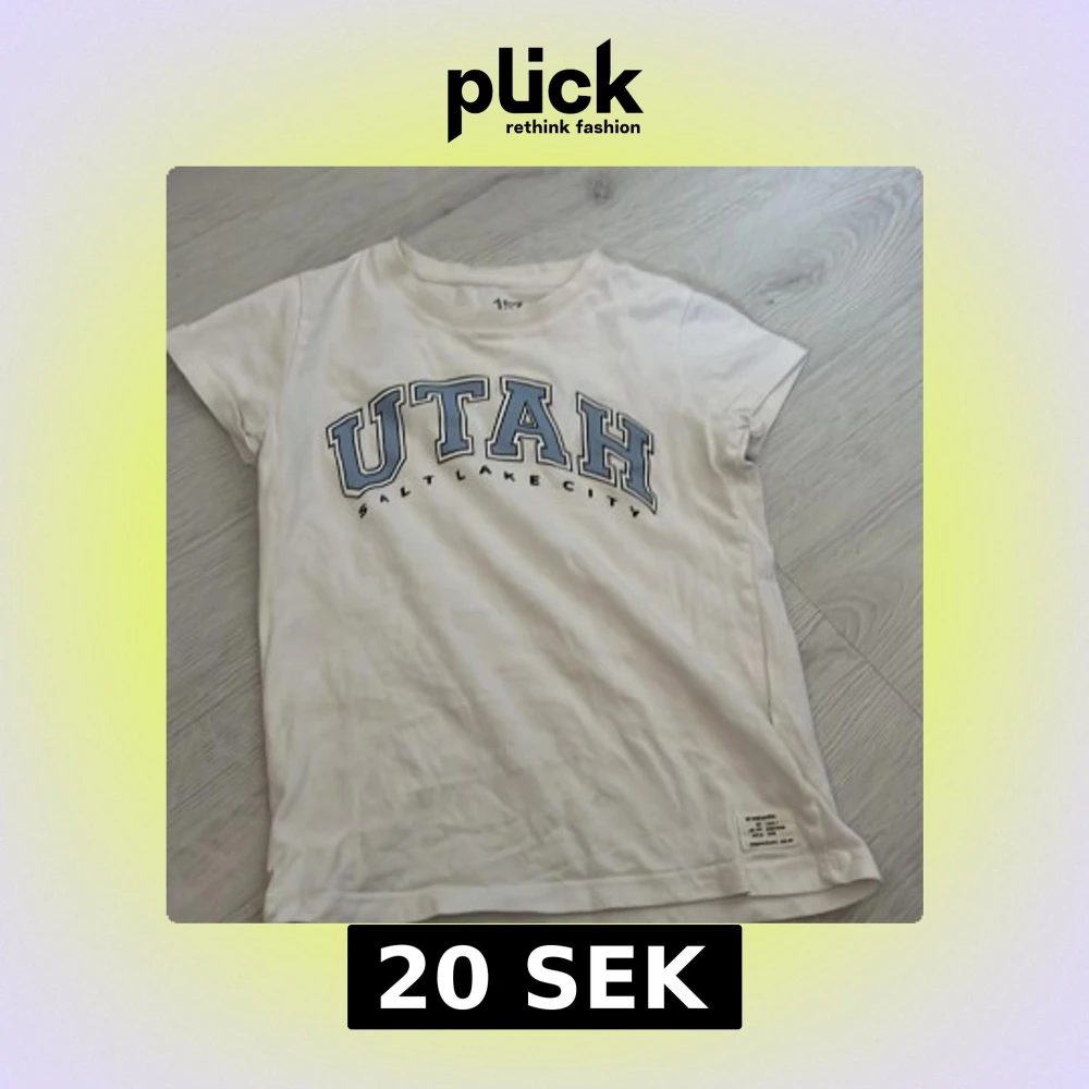 Säljer en vit t-shirt från 157 med tryck 'UTAH Salt Lake City' i blått och svart. T-shirten har korta ärmar och en rund halsringning. Perfekt för en avslappnad stil.