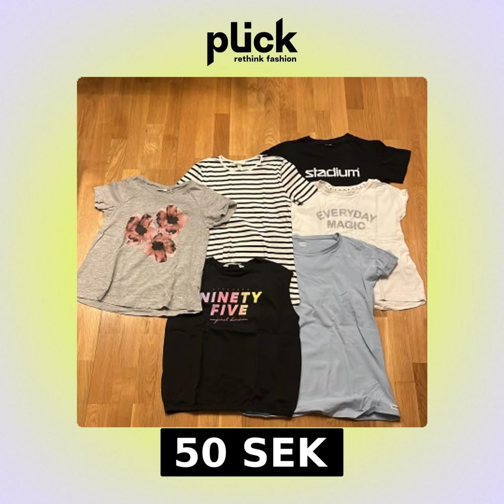 Ett paket med sex olika t-shirts. Inkluderar en grå t-shirt med blommigt tryck, en randig svartvit t-shirt, en svart t-shirt med texten 'Ninety Five', en vit t-shirt med texten 'Everyday Magic', en ljusblå t-shirt och en svart t-shirt med 'Stadium' logga. Perfekt för vardagsbruk!