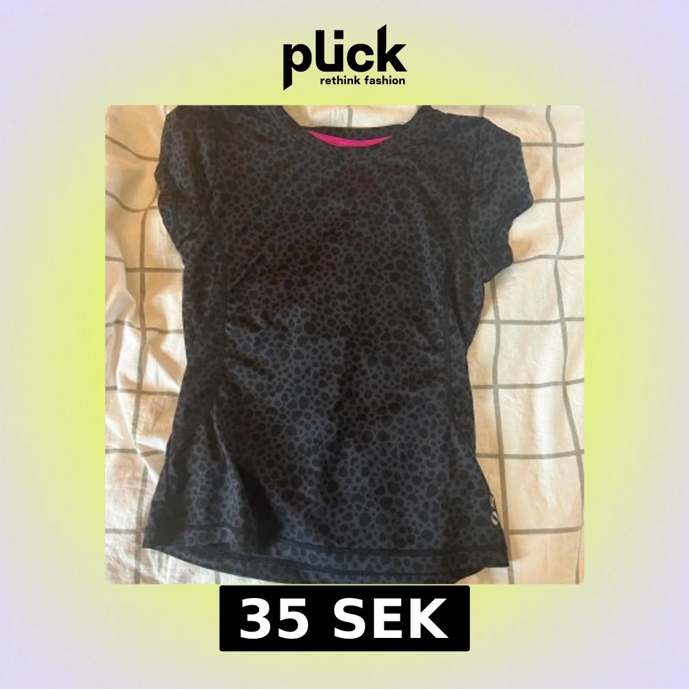 Svart kortärmad träningst-shirt från SOC med diskret leopardmönster. Gjord i ett lätt och stretchigt syntetmaterial som andas, perfekt för sport eller gym. Rund halsringning med rosa detalj på insidan av kragen. Sitter snyggt och följsamt på kroppen. Passar även mig som vanligtvis har 146/152 eller xxs