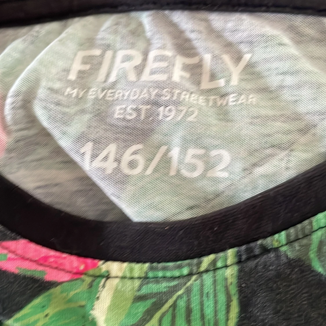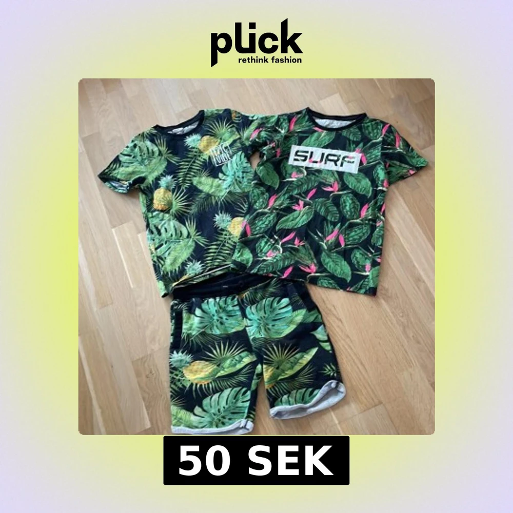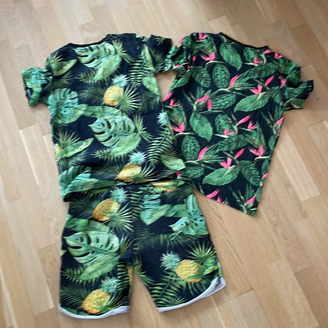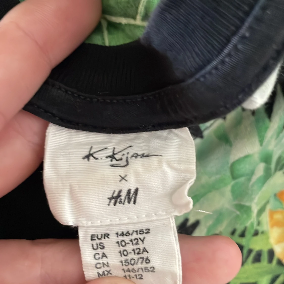 Snygg t-shirt från H&M x K. Kijak i tropiskt mönster med gröna blad och gula ananaser på svart botten. Rund halsringning och korta ärmar. Perfekt för dig som gillar färgstarka prints och sommarkänsla.