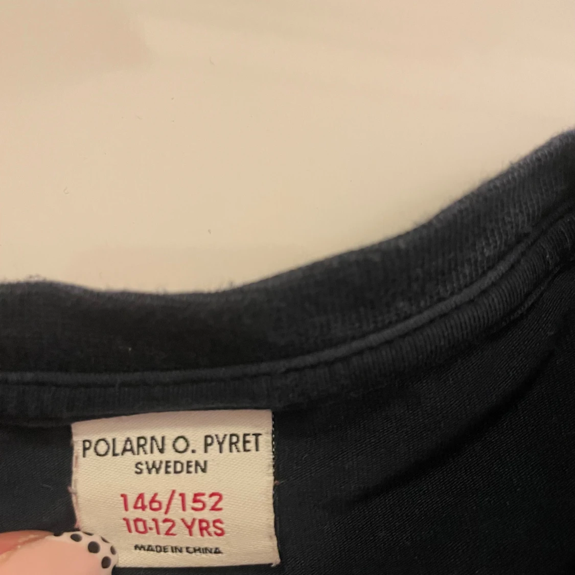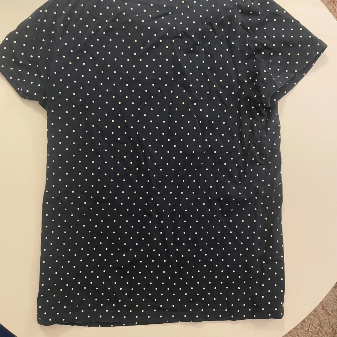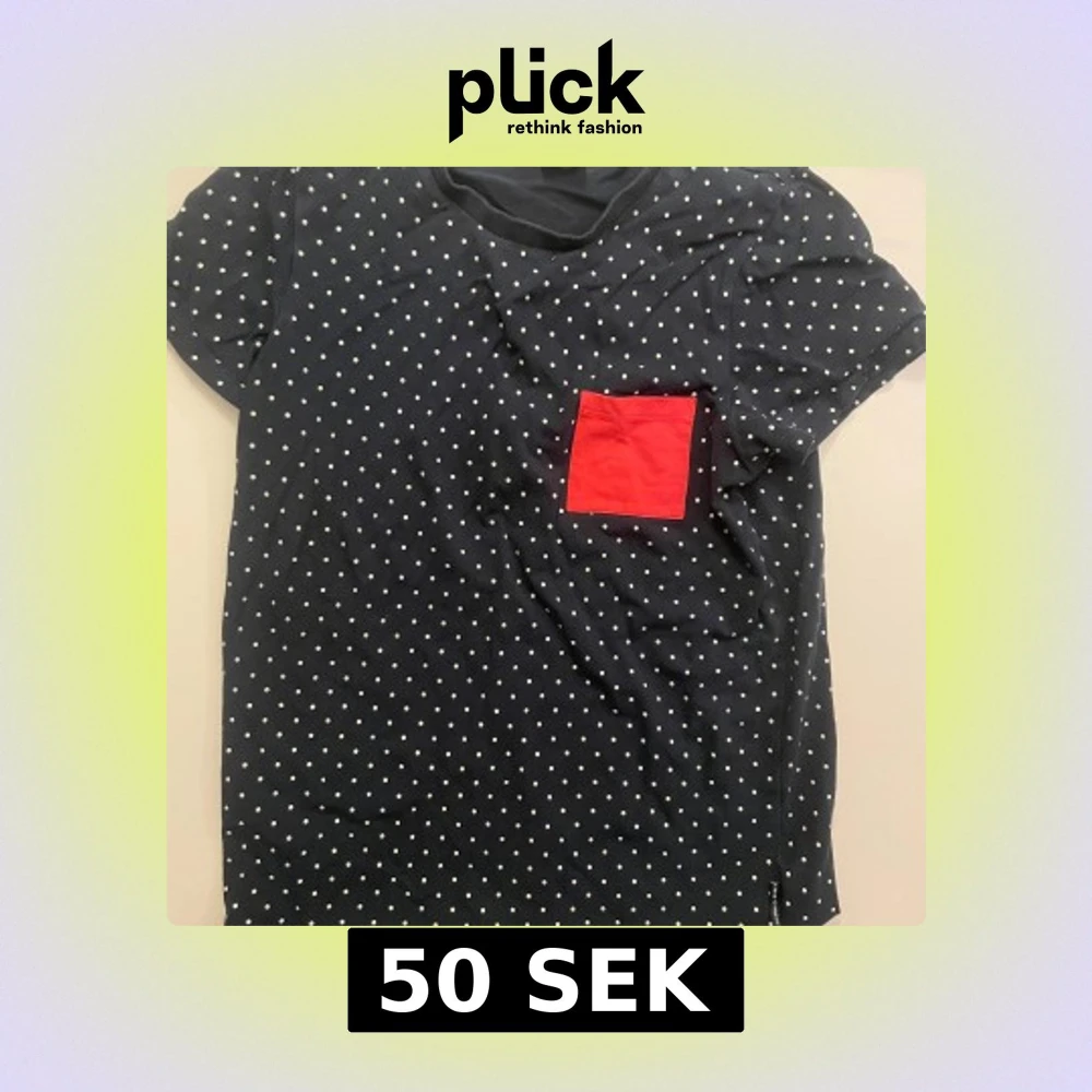 Snygg mörkblå t-shirt från Polarn O. Pyret med vita prickar över hela och en röd fyrkantig bröstficka som sticker ut. Klassisk rund hals och korta ärmar. Tillverkad i mjuk bomull som är skön mot huden. Perfekt för dig som gillar färg och mönster.