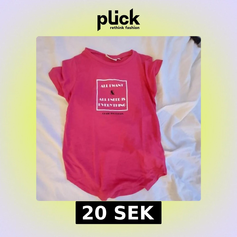 Säljer en rosa t-shirt från Red & Blue med trycket 'All I want & all I need is everything' på framsidan. T-shirten har korta ärmar och en rund halsringning. Perfekt för en avslappnad stil.