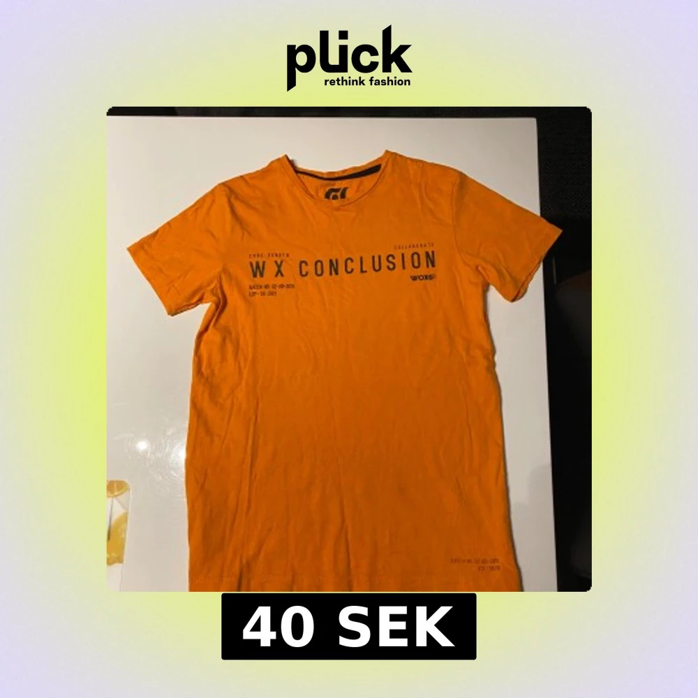 Säljer en orange t-shirt från Woxo med svart tryck framtill där det står 'WX Conclusion'. T-shirten har rund halsringning och är tillverkad i 100% bomull. Perfekt för dig som gillar färgstarka plagg! Den är i storlek 146-152 (11-12 år). För ENDAST 40kr så får du en t shirt utan några defekter och i fruktansvärt bra skick!
