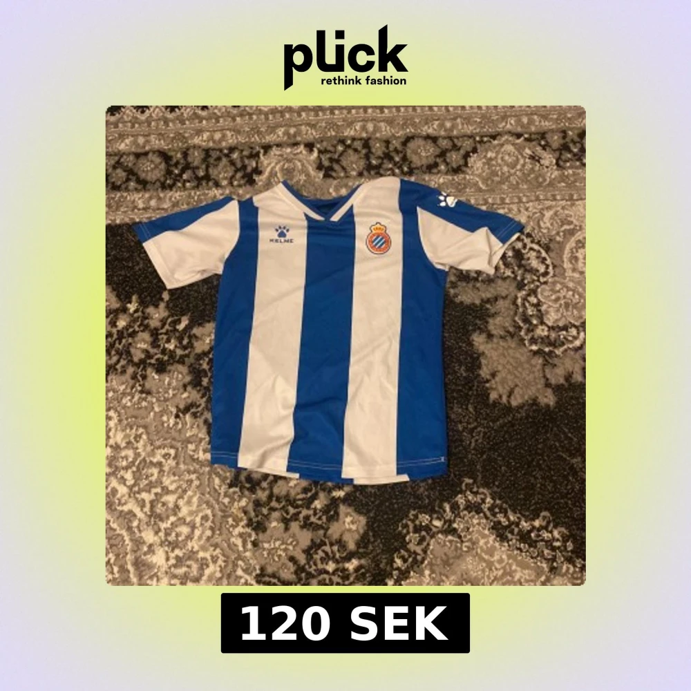 Säljer en blåvit randig fotbollströja från Kelme med korta ärmar. Tröjan har klubbmärke på bröstet och nummer 8 på ryggen. Perfekt för fotbollsfans!