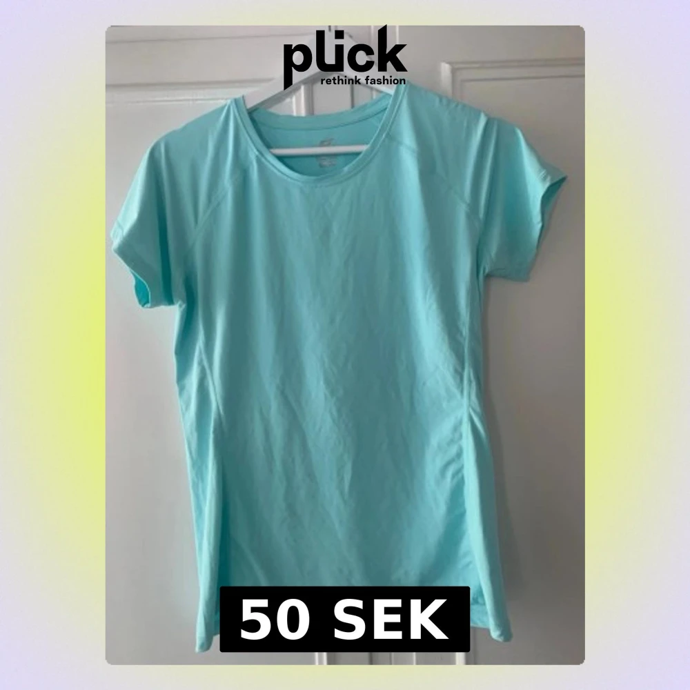 En ljusblå t-shirt med rund hals och korta ärmar. Perfekt för träning eller aktiva dagar. Tillverkad i ett syntetmaterial som andas och ger en bekväm passform. I jättefint skick.