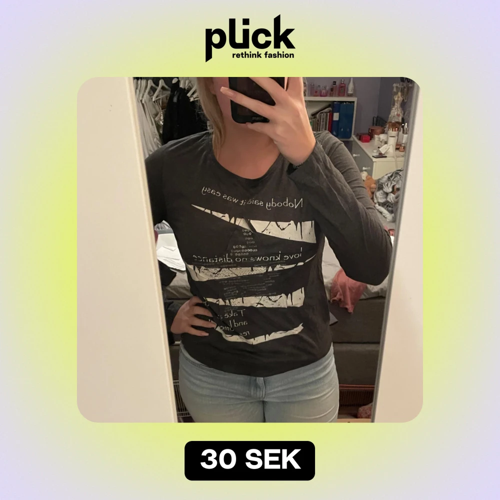 Säljer en mörkgrå tröja med ett vitt tryck på framsidan. Perfekt för en avslappnad stil och passar bra till jeans. Tröjan är i bra skick då den knappt är använd. Perfekt för höst och vår! Köparen står för frakten💖