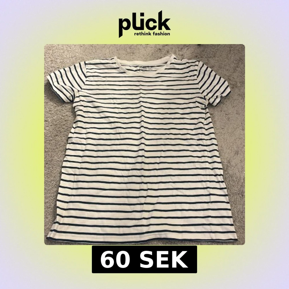 Säljer en vit och blå randig t-shirt från Basic You i ekologisk bomull. Den har en klassisk rund hals och korta ärmar, perfekt för en avslappnad stil. Passar bra till både jeans och shorts.