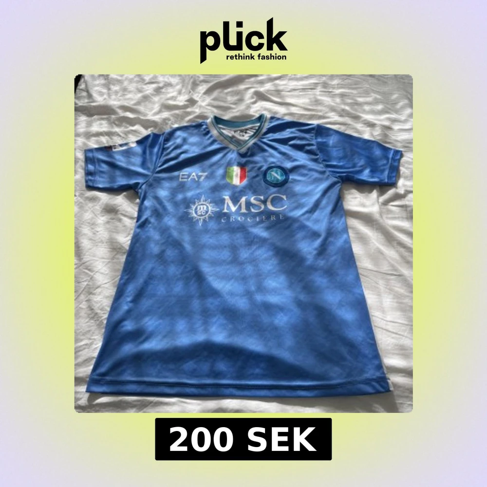 Säljer en blå Napoli fotbollströja med Maradona 10 på ryggen. Tröjan har klubbmärke, italienska mästarmärket, MSC sponsortryck och Serie A-märke på ärmen. Klassisk V-ringning med vita och blå detaljer.