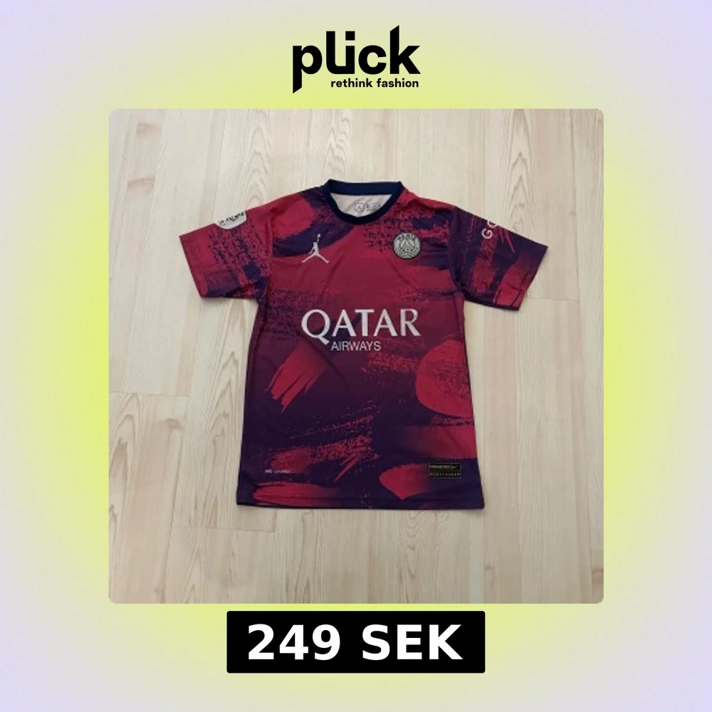 Snygg PSG fotbollströja med Mbappé 7 på ryggen, tillverkad i lätt och ventilerande material. Tröjan har en cool mix av röd och mörkblå färg med abstrakt mönster, Paris Saint-Germain-märke på bröstet och Jordan-logga. Perfekt för dig som älskar fotboll och streetstyle.