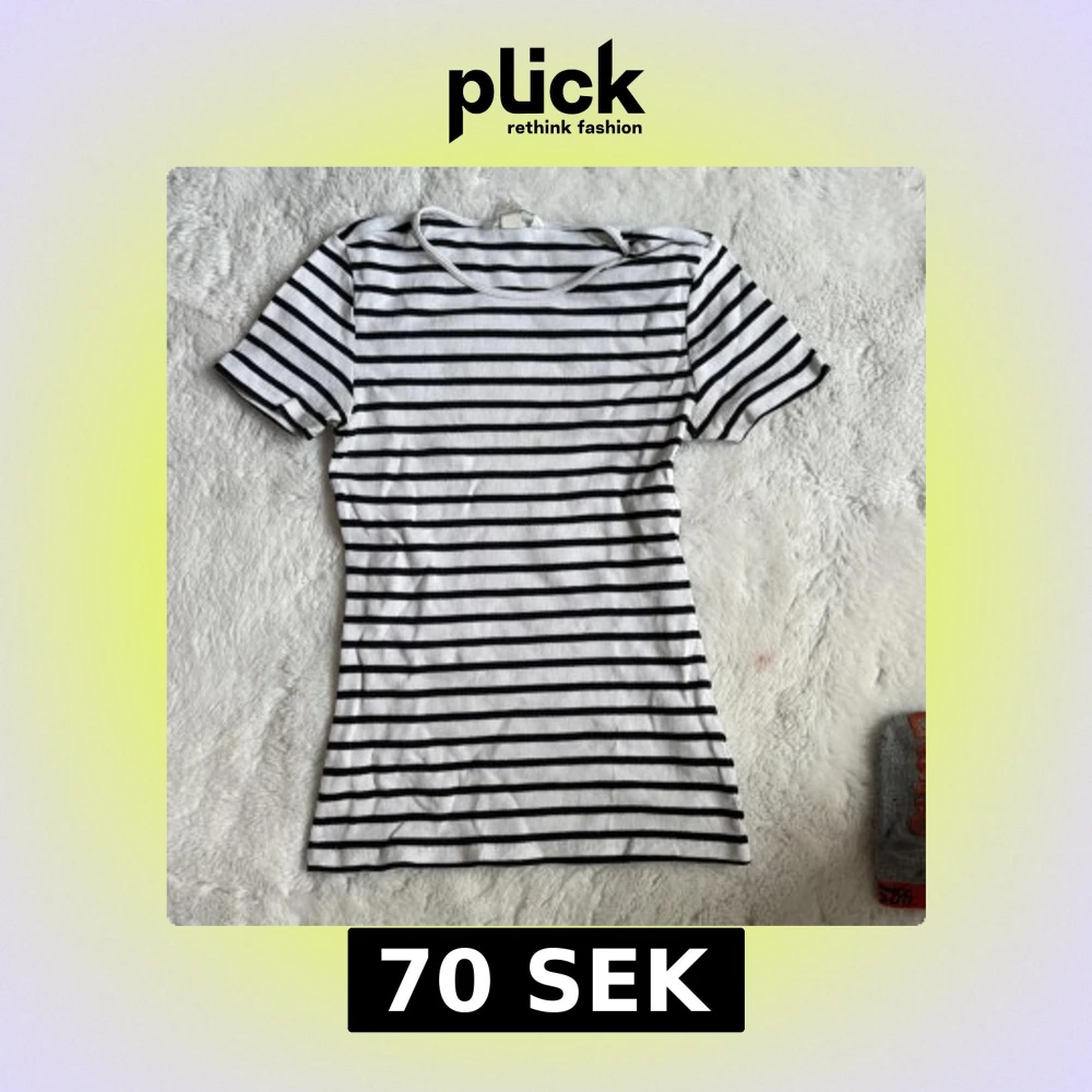 Säljer en klassisk vit och svart randig t-shirt från H&M. Den är kortärmad och har en ribbad struktur som ger en skön passform. Perfekt för en avslappnad stil.