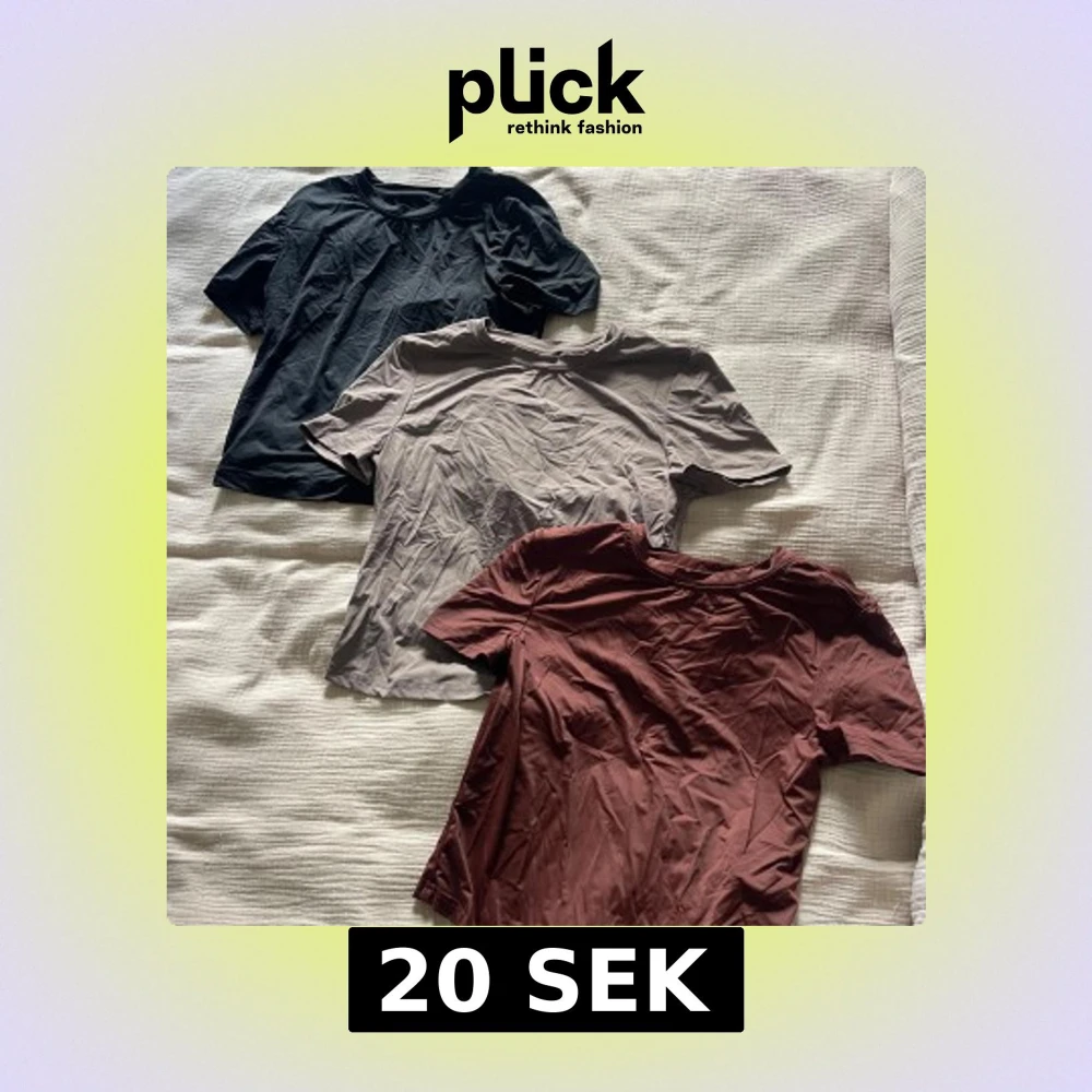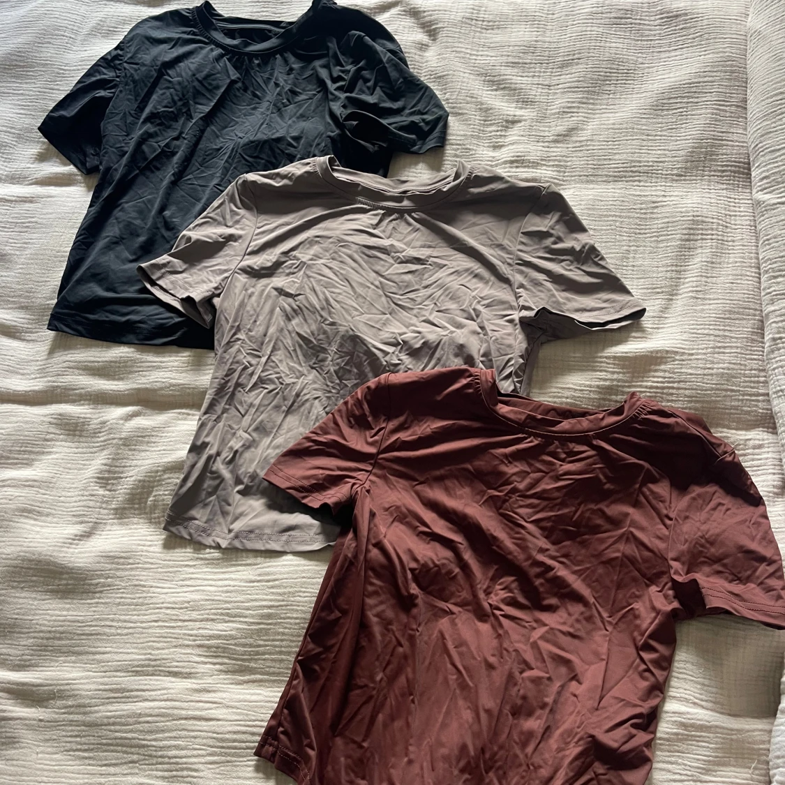 Tre stilrena basic t-shirts (skimsdupe) i svart, beige och brun. Alla har klassisk rund halsringning och kort ärm. Går att köpa separat 20kr st eller alla 3 för 50kr!!