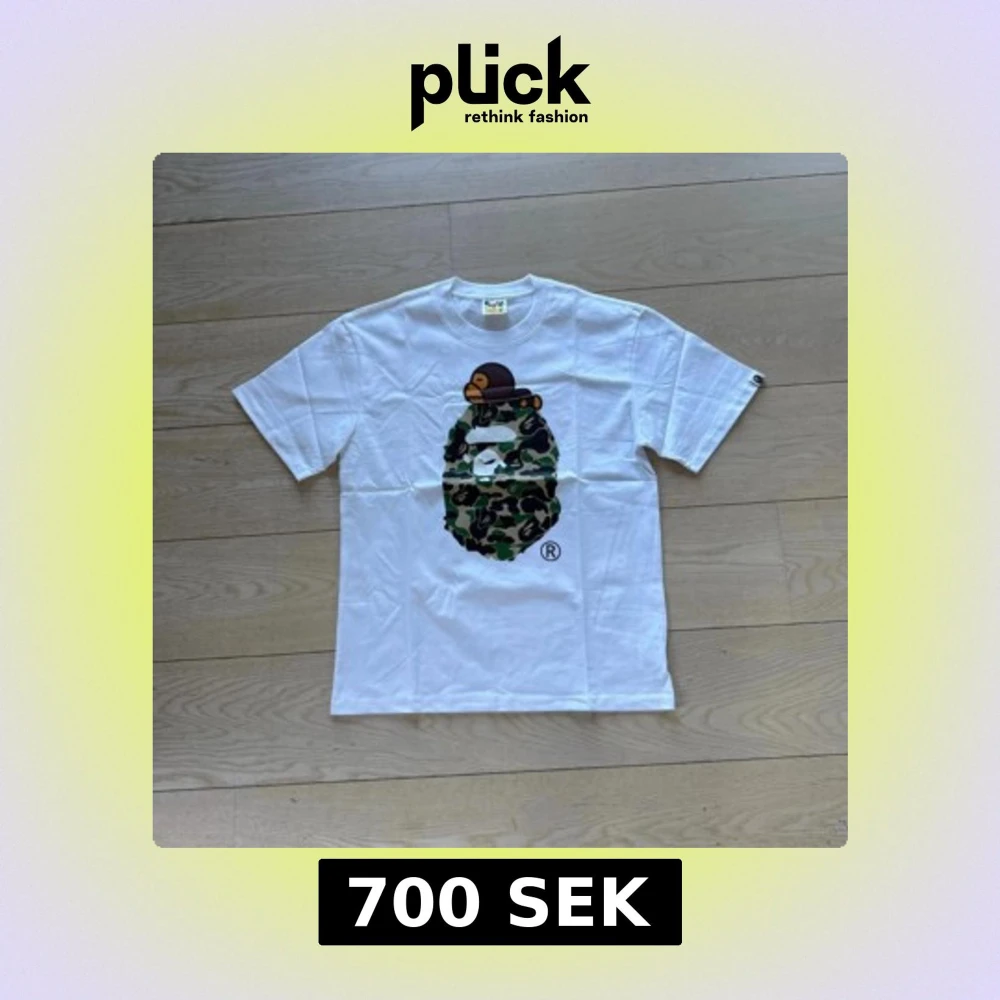 Säljer en vit t-shirt från Bape med ikoniskt camo-mönstrat ansikte och en liten apa på huvudet. Klassisk passform och rund hals. T-shirten har korta ärmar och är tillverkad i mjuk bomull. Perfekt för dig som gillar streetwear.