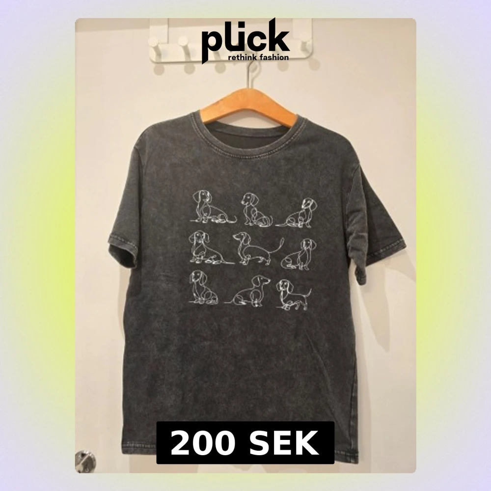 Cool svart t-shirt med vit grafisk illustration av taxar i olika poser på bröstet. T-shirten har rund hals och korta ärmar. Perfekt för dig som gillar hundar och vill ha en unik look.