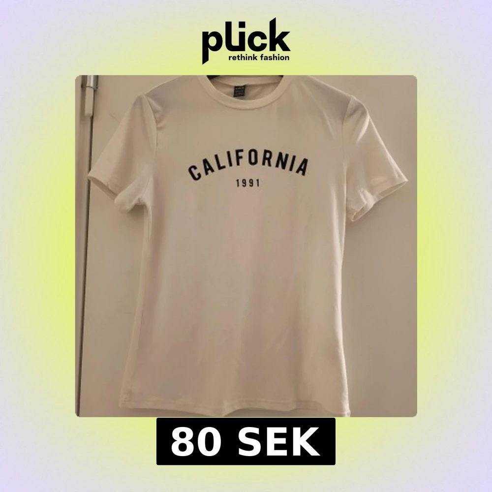Snygg vit t-shirt med texten 'California 1991' tryckt i svart på framsidan. Perfekt för en avslappnad stil. Kortärmad och i mjukt material. Använt 1 gång. Köpt för 100 kr från shein säljer för 80kr