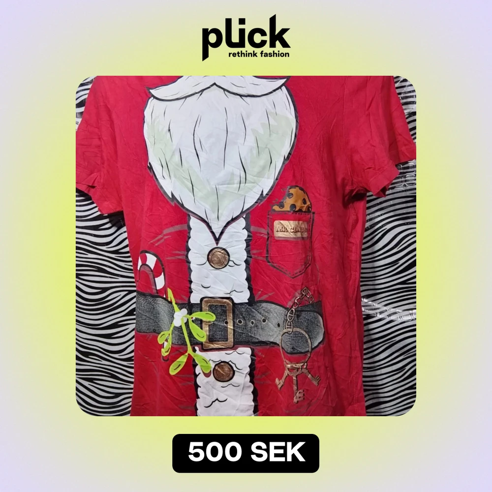 Rolig röd t-shirt med ett tryck av en tomtedräkt, komplett med skägg, bälte och godis. Perfekt för julfesten eller som en rolig present. Kortärmad och i bekvämt material.