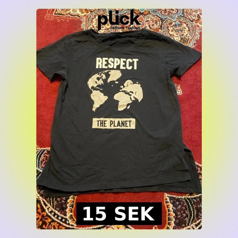 Cool svart t-shirt med beige tryck på bröstet som visar världskartan och texten 'RESPECT THE PLANET'. Klassisk rund hals och korta ärmar. Perfekt för dig som vill göra ett statement med din stil.