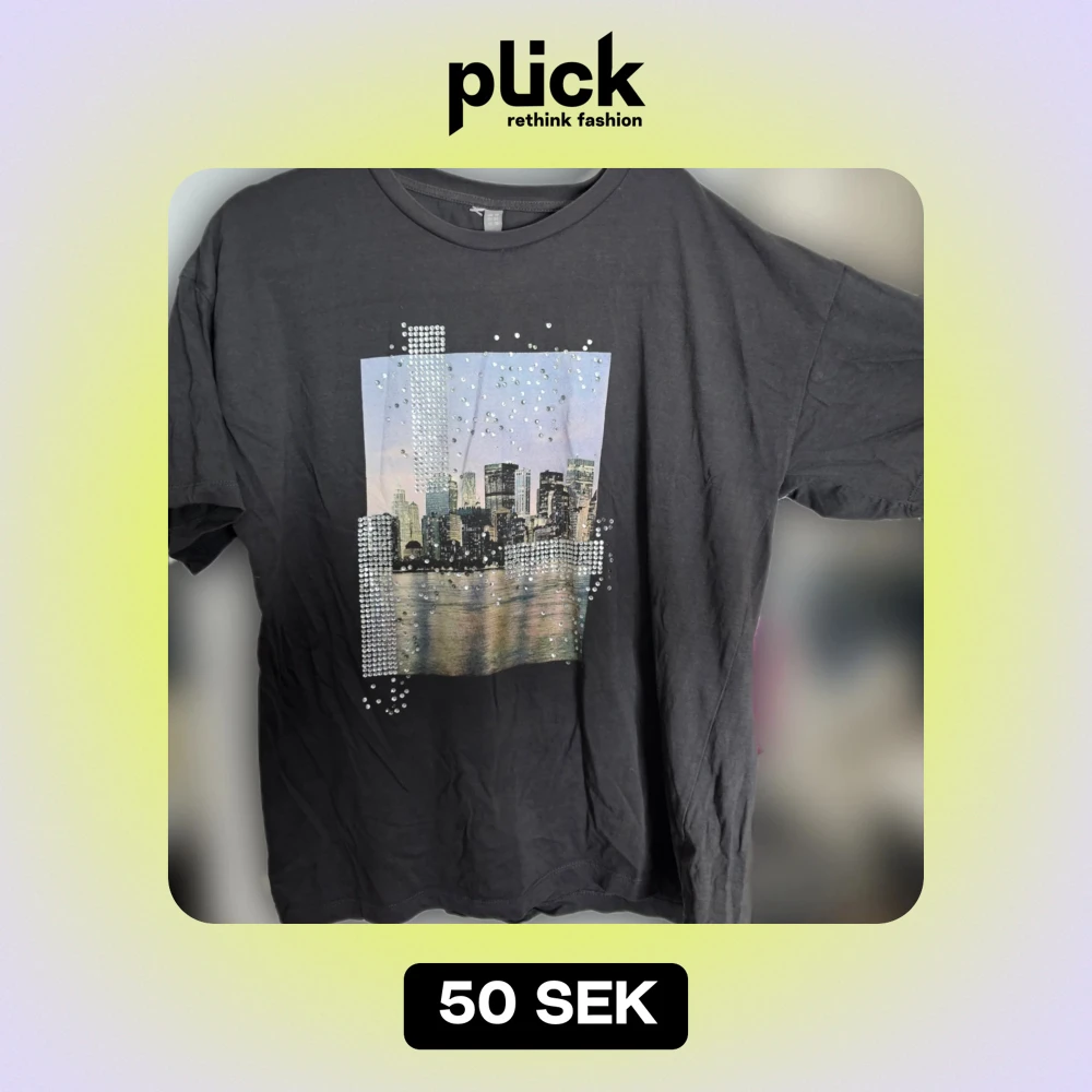 Säljer en mörkgrå t-shirt med en cool stadsbild på framsidan. Storlek 42/L. Den har strassdetaljer som ger en glittrig effekt över motivet. Knappt använd och inga synliga defekter.