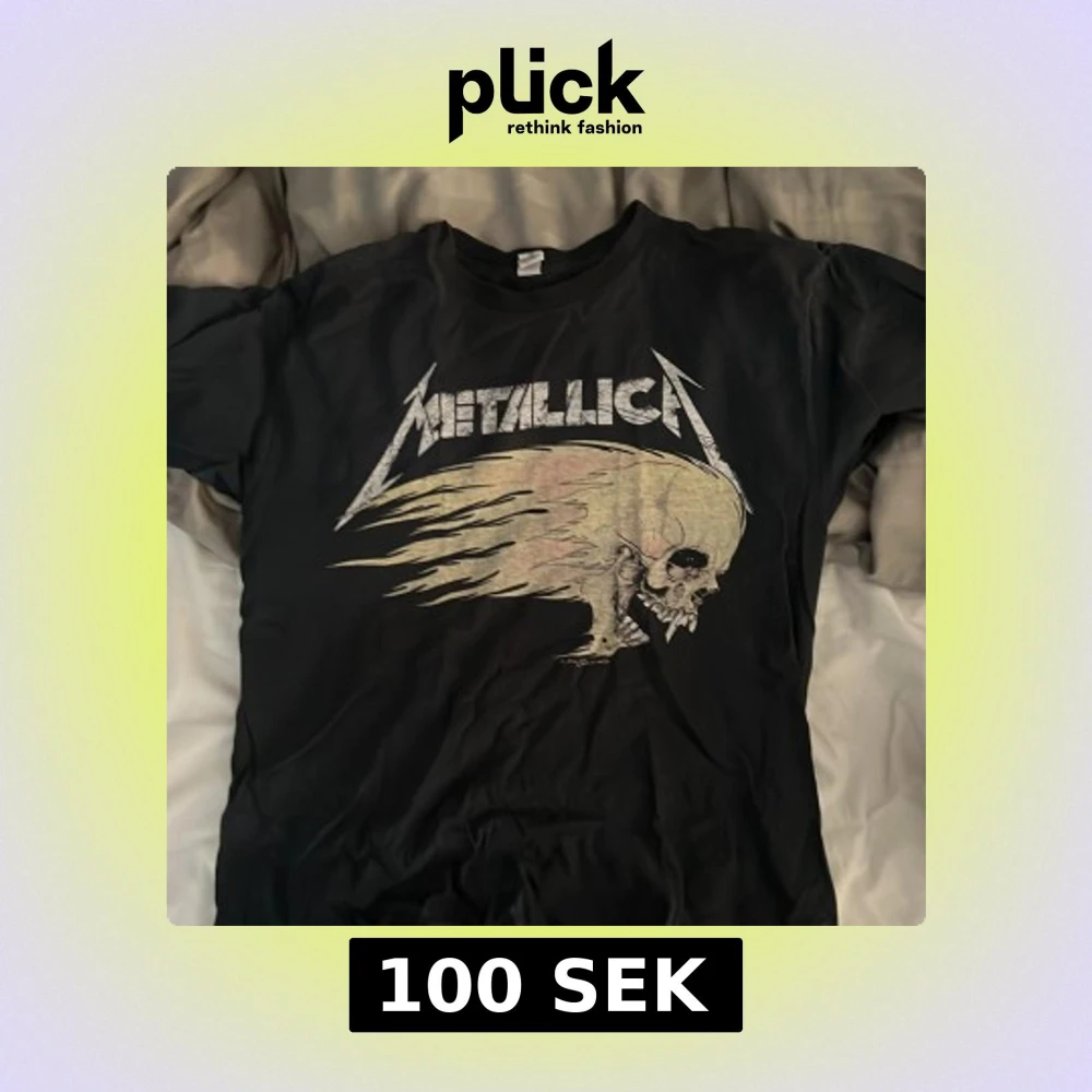 Svart Metallica t-shirt från Gildan med stort tryck av bandets logga och en dödskalle med eldflammor på framsidan. Baksidan har turnélistan och en solformad dödskalle. Klassisk rund hals och korta ärmar, perfekt för dig som älskar rock och bandmerch.