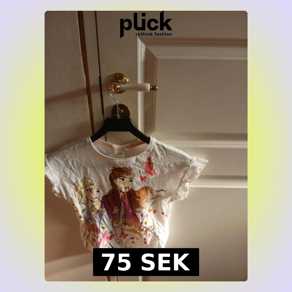Säljer en vit croppad t-shirt med färgglatt tryck av tecknade figurer (Elsa och Anna från frost)och fjärilar på framsidan. T-shirten har korta ärmar och rund hals. Perfekt för dig som gillar lekfulla motiv och en avslappnad stil.