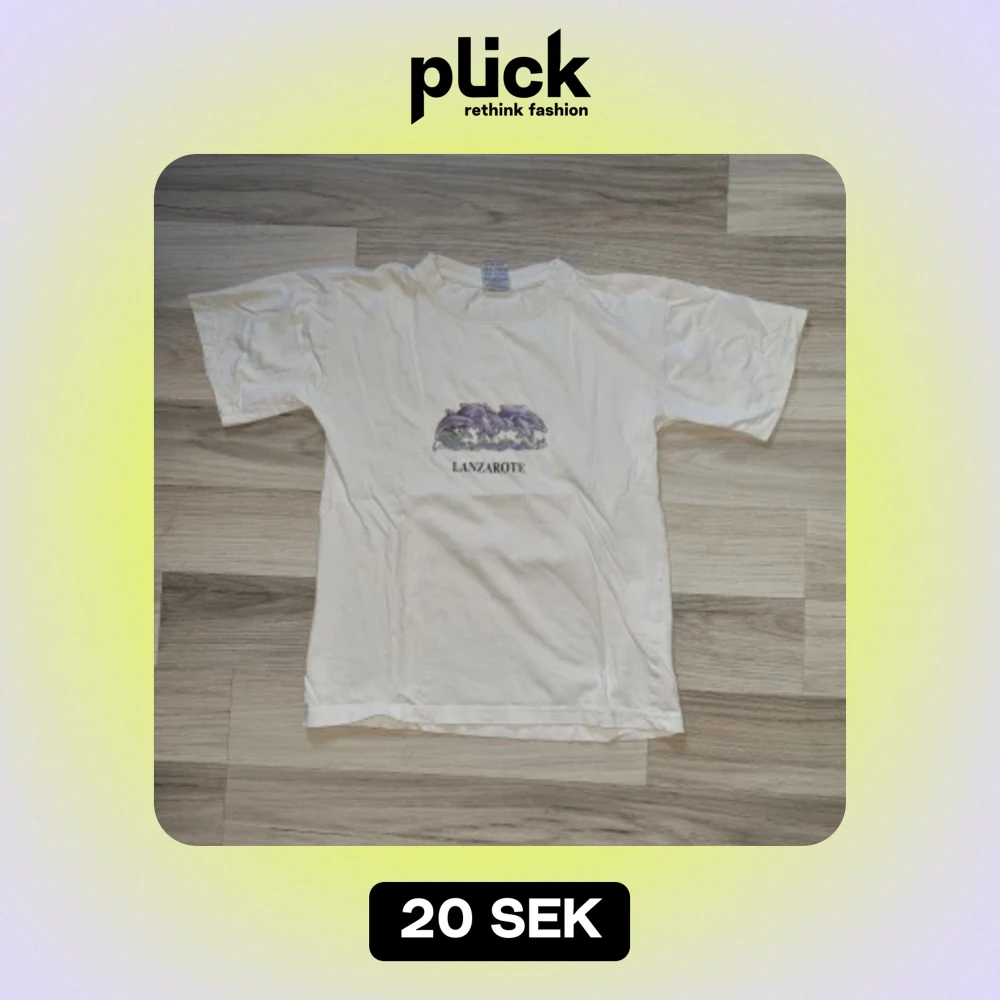 En vit t-shirt med ett tryck av Lanzarote på framsidan. T-shirten har korta ärmar och en normal passform. stl 9/11 motsvarar 146/152.